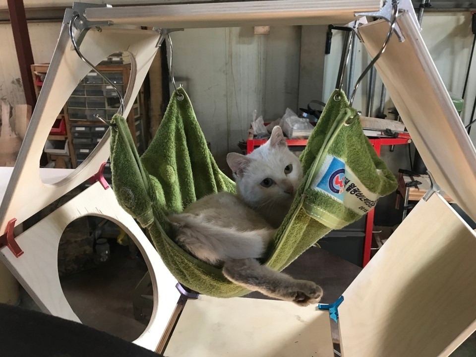 다친 길냥이 미미를 치료해 주느라 작업실 내에서 보호하며 캣타워에 수건으로 해먹을 만들어 사용하고 있습니다.