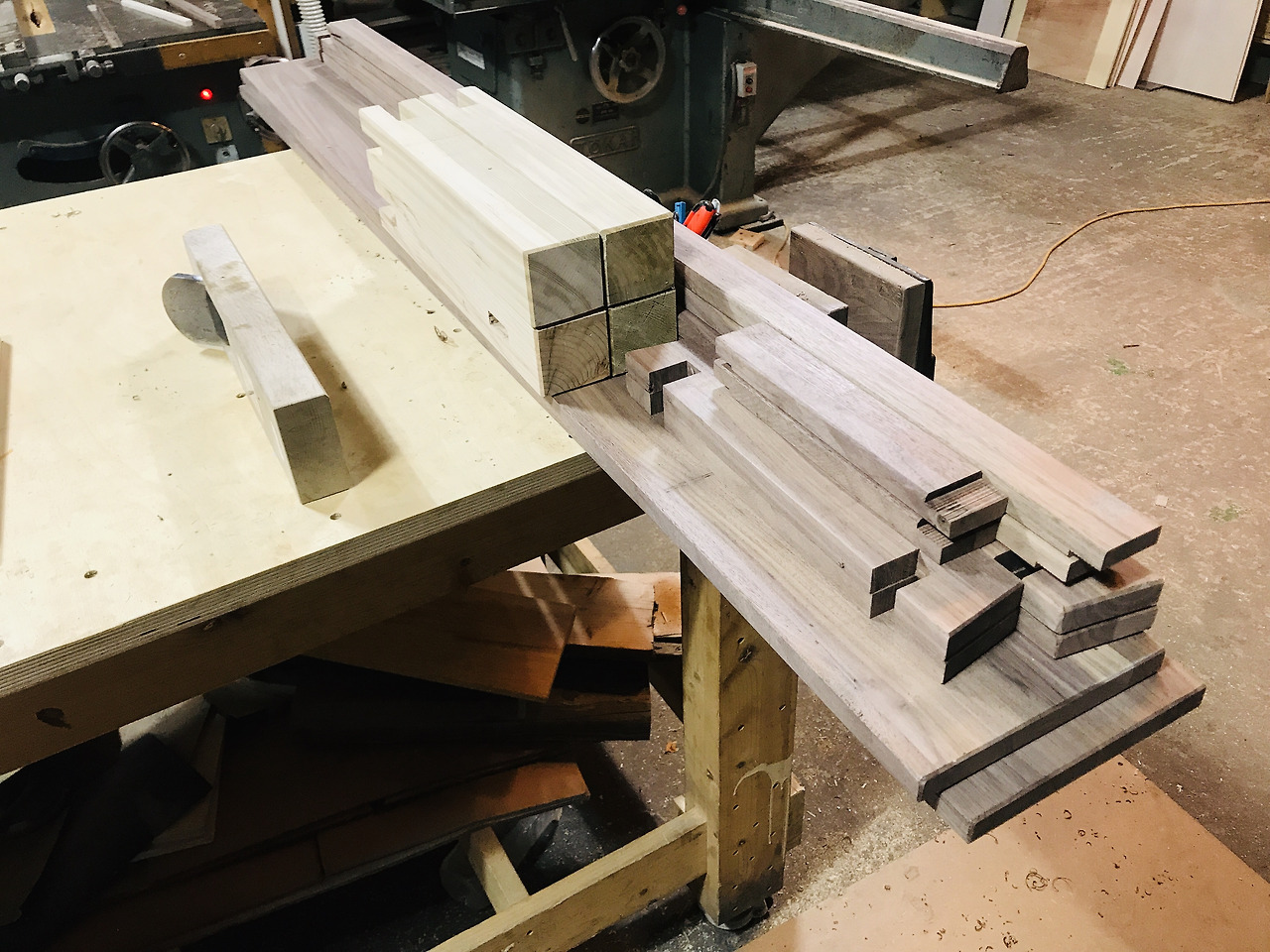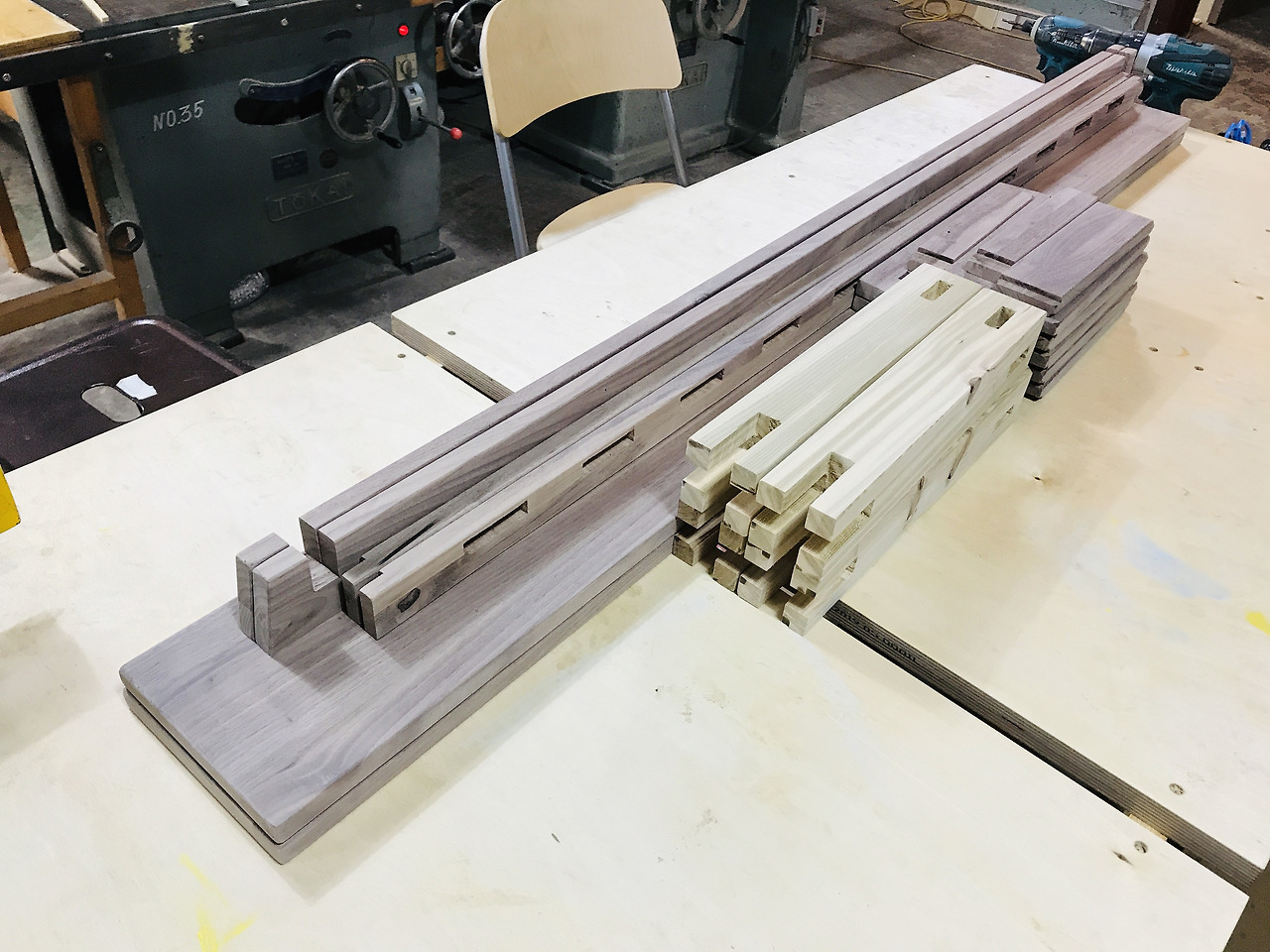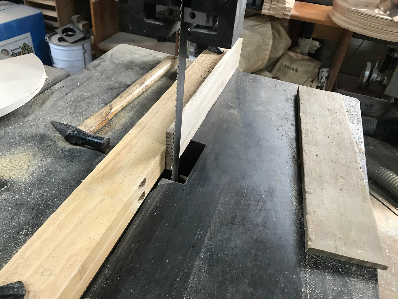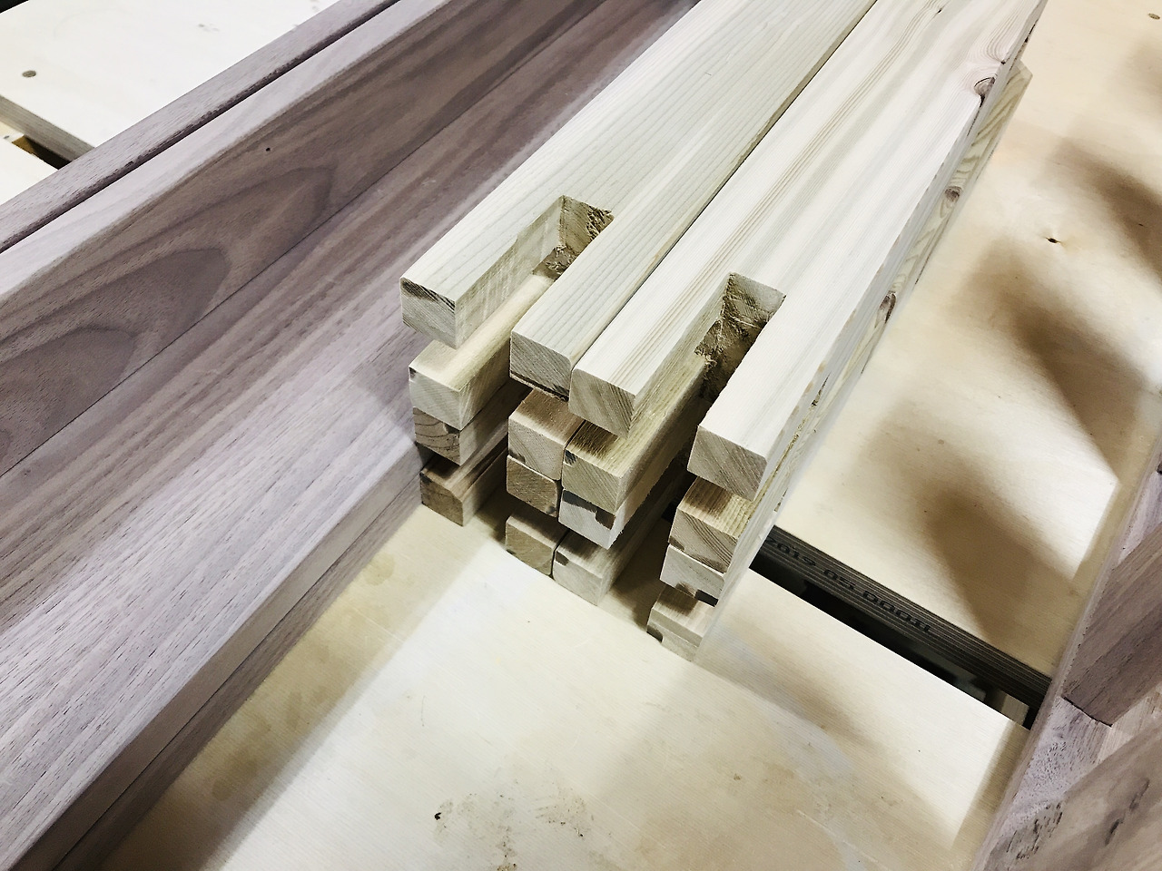 다음날 부재를 모두 분해해 하나씩 샌딩을 했다. 가지런히 모아 놓고 단체 사진 한방 찍고 하부부터 다시 조립 시작! 다리는 심플하고 튼튼해서 좋긴 한데, 그래도 뭔가 디자인 변화를 주고 싶어서 발 부분에 45도 경사를 줬다. 하나를 먼저 만들었는데, 아뿔싸 너무 과한 듯싶었으나 이미 엎질러진 물. 나머지 셋도 똑같이 작업했다. 뭔가 되겠지 하며 경사로 쳐냈다. 경사각을 주기 전에는 발바닥으로 서 있는 느낌이라면 경사각을 세게 주고 나니 발가락으로 서 있는 느낌이다.