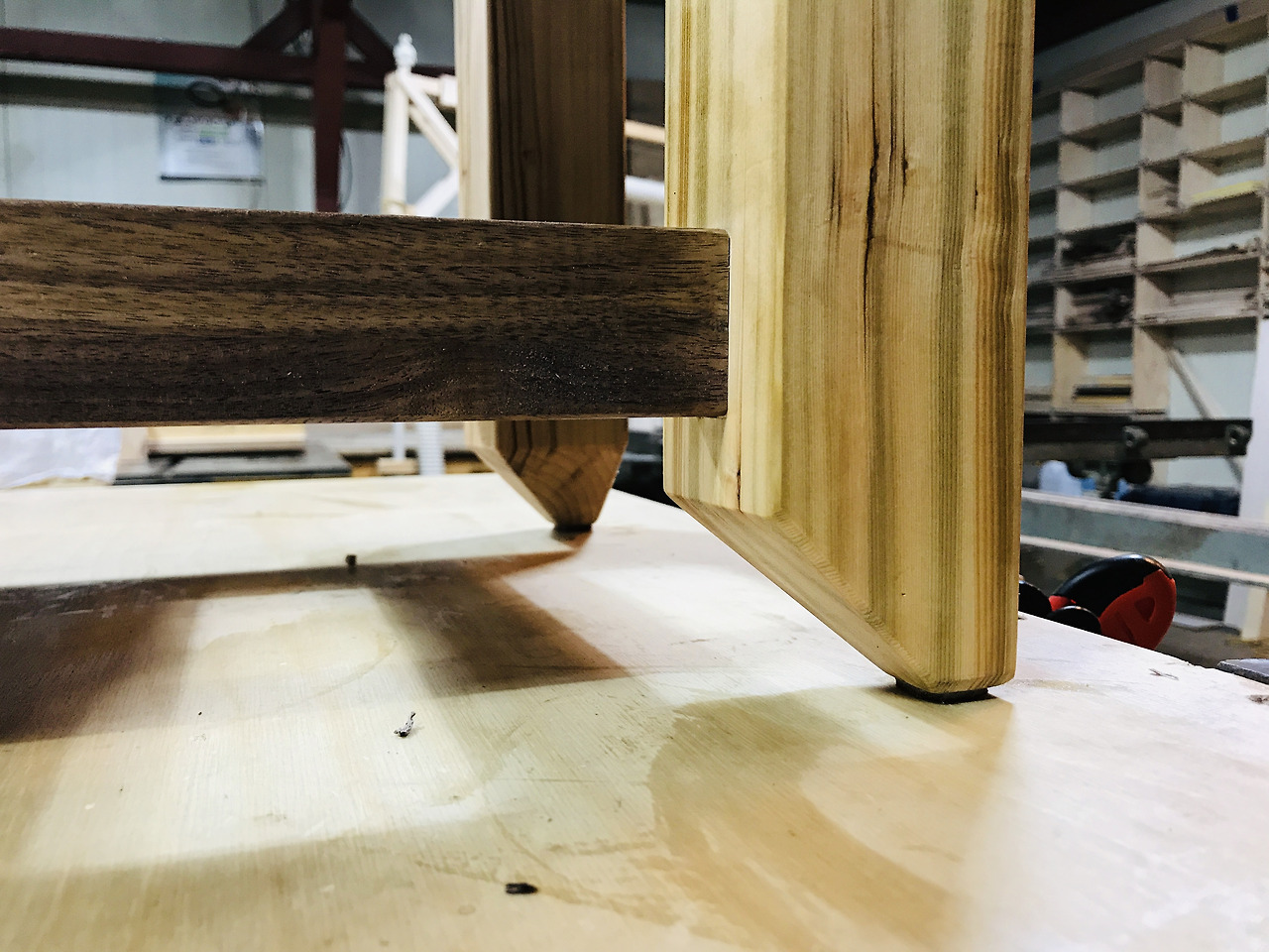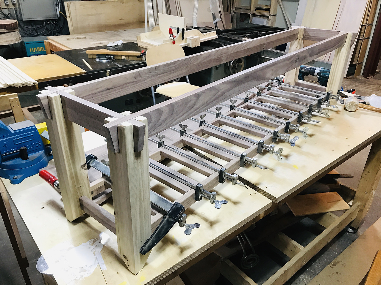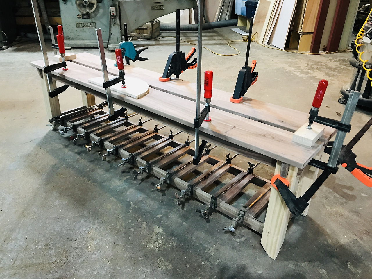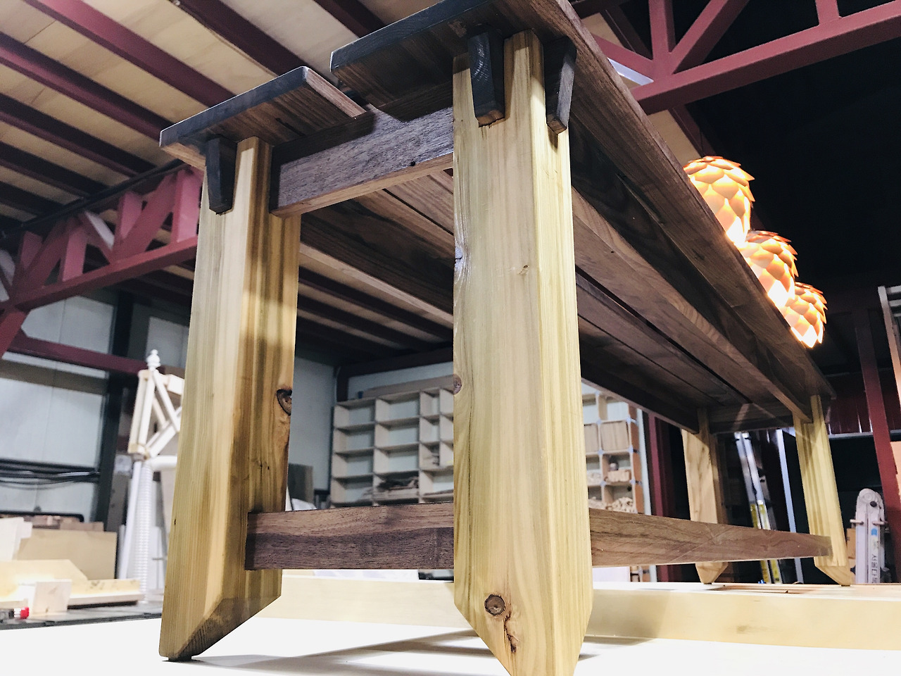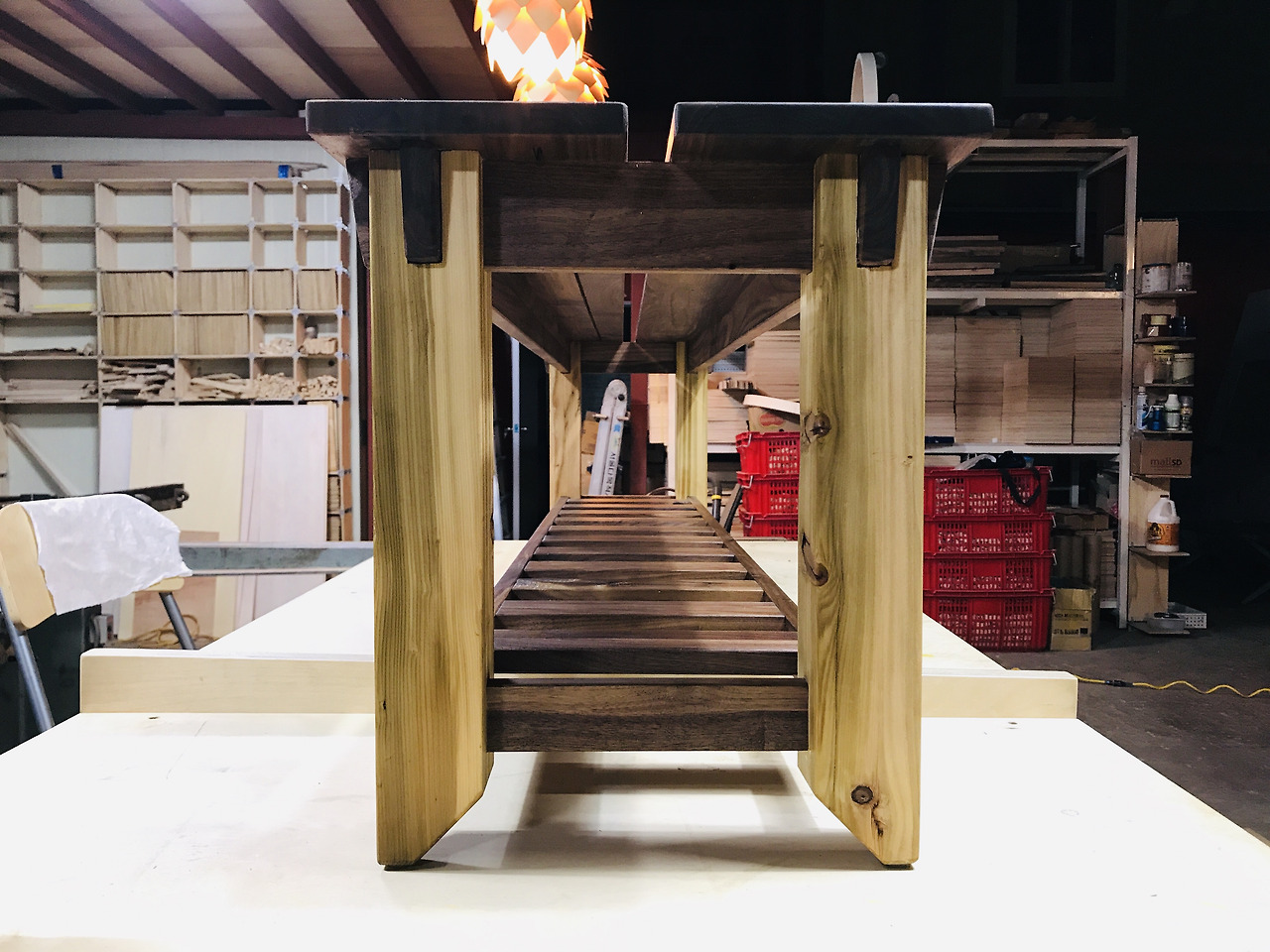 차례차례 조립을 했다. 부재가 교차하는 부분에는 목공용 접착제를 이용해 잘 붙여가며 작업했다. 그리고 유격과 흔들림이 생기지 않도록 클램프로 조였다. 상판까지 다 얹은 후에는 총 6개의 나사못을 이용해 결합시키고 목심으로 흔적을 메꾸고 나니 슬슬 끝이 보인다.