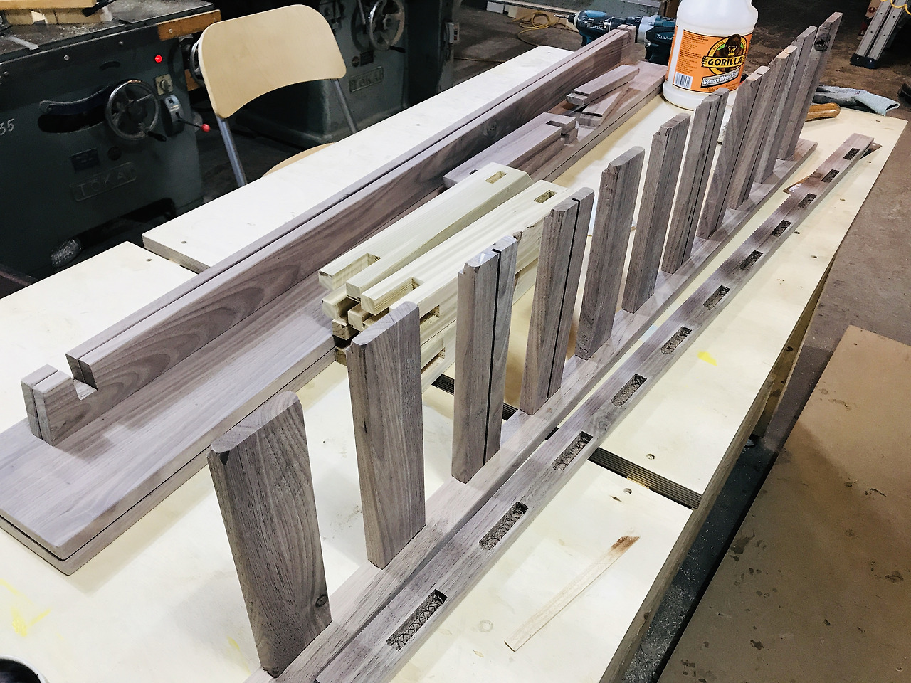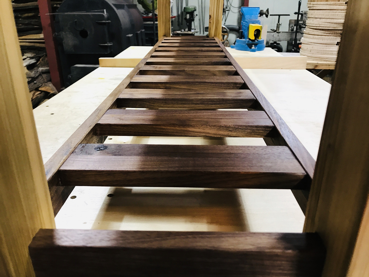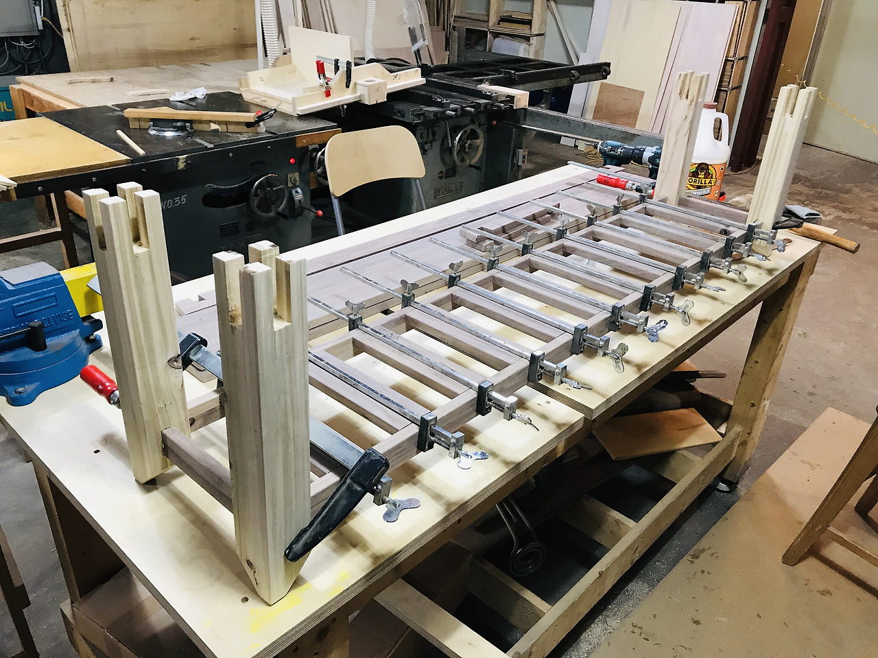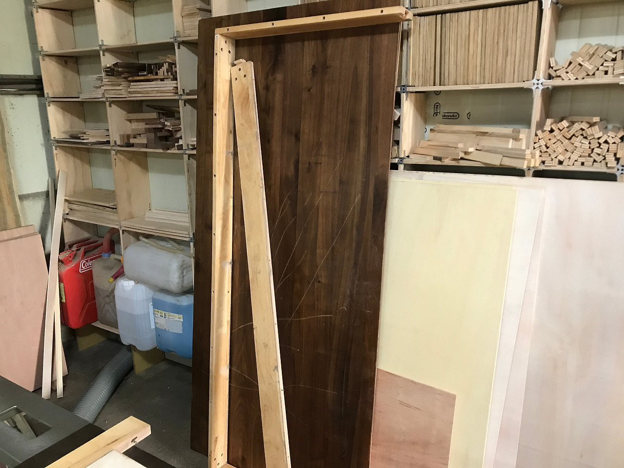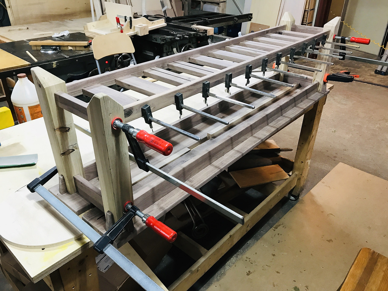 차례차례 조립을 했다. 부재가 교차하는 부분에는 목공용 접착제를 이용해 잘 붙여가며 작업했다. 그리고 유격과 흔들림이 생기지 않도록 클램프로 조였다. 상판까지 다 얹은 후에는 총 6개의 나사못을 이용해 결합시키고 목심으로 흔적을 메꾸고 나니 슬슬 끝이 보인다.