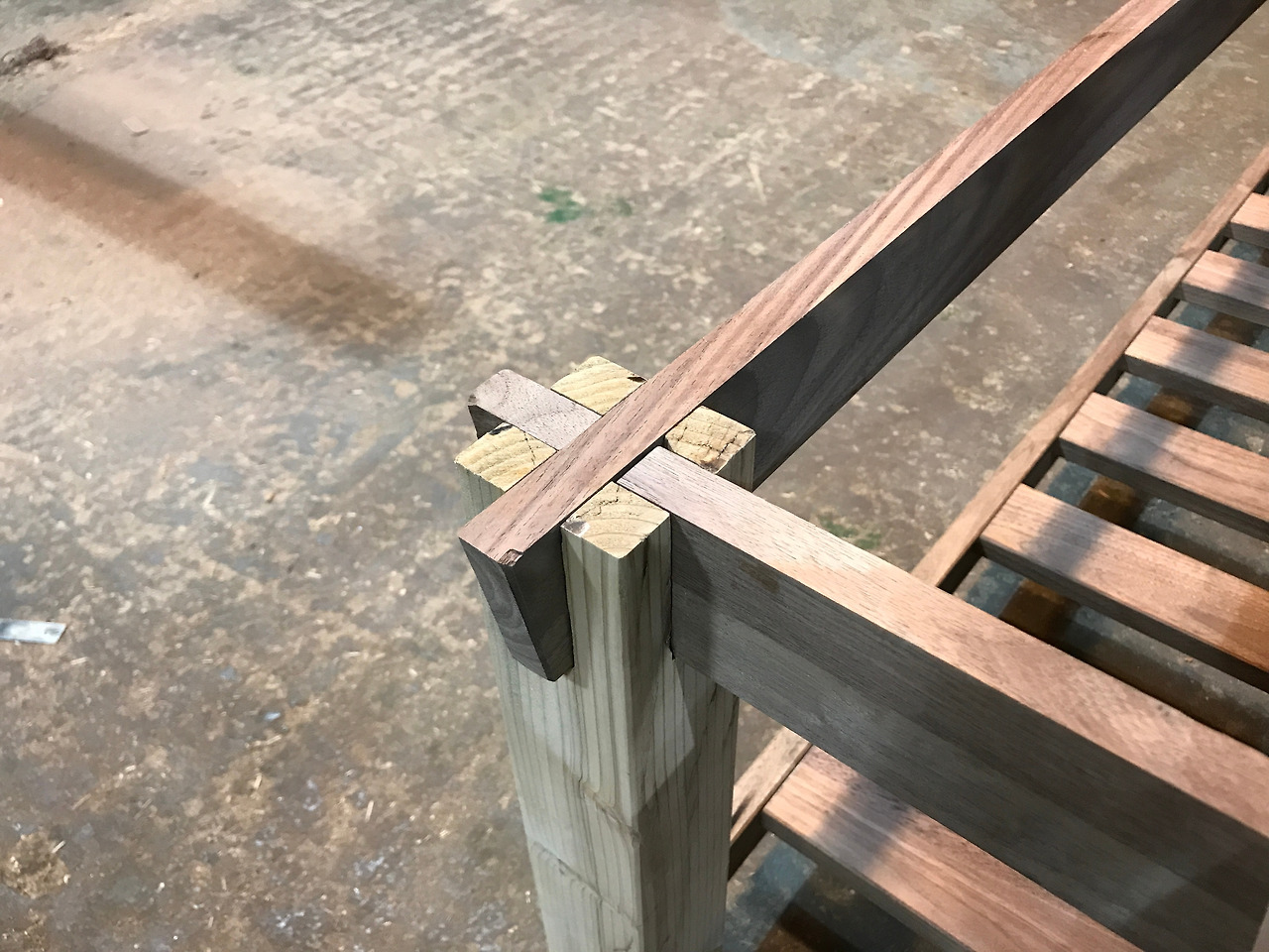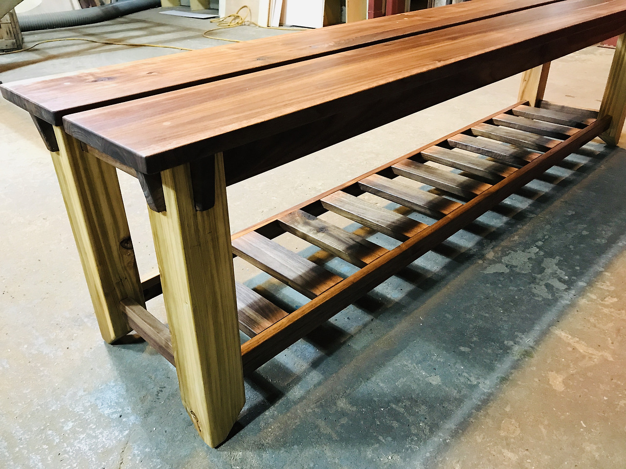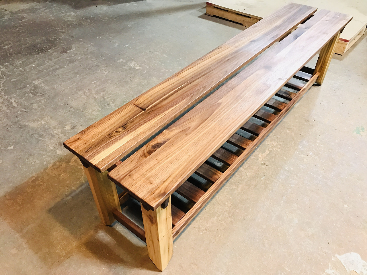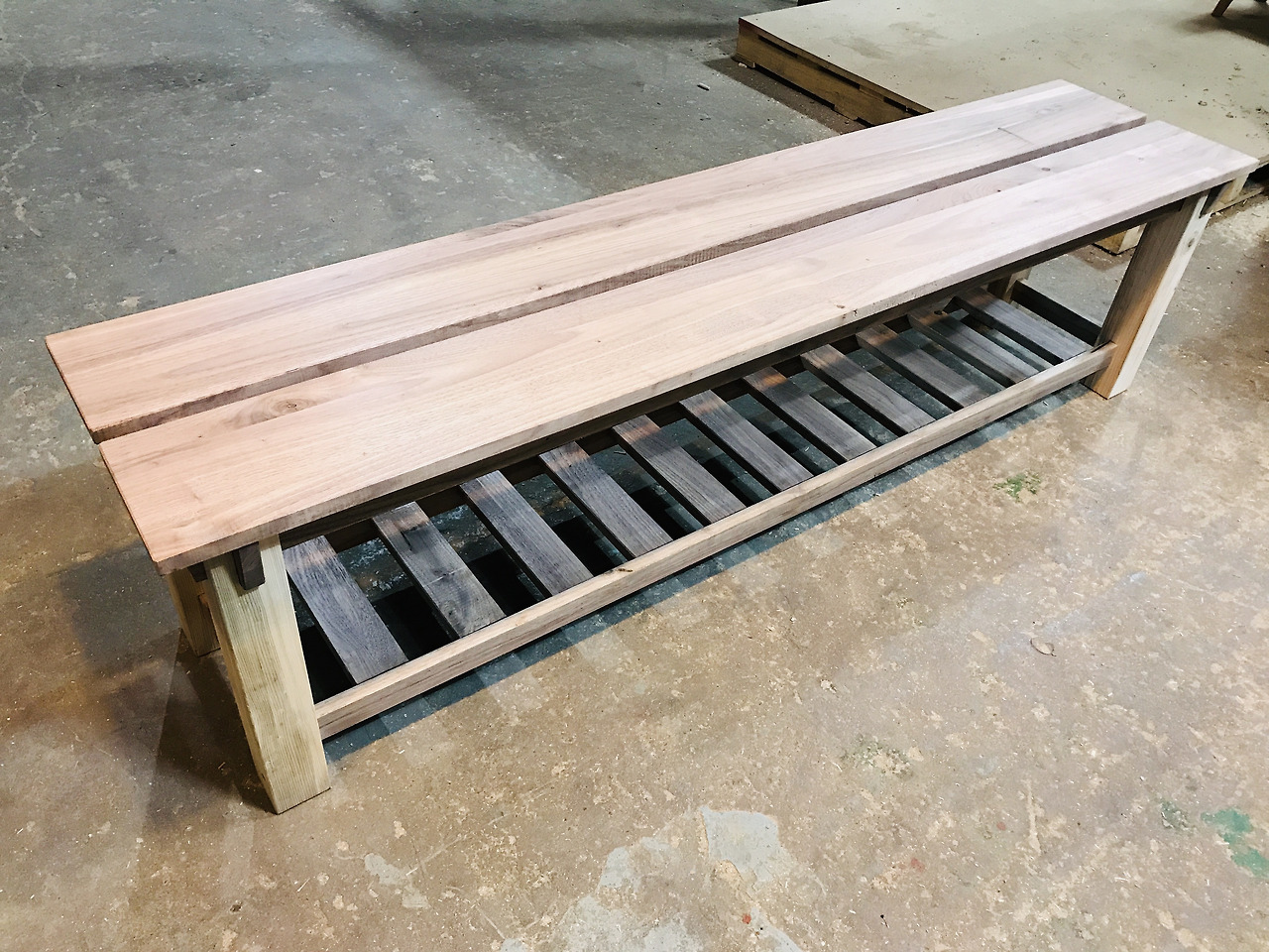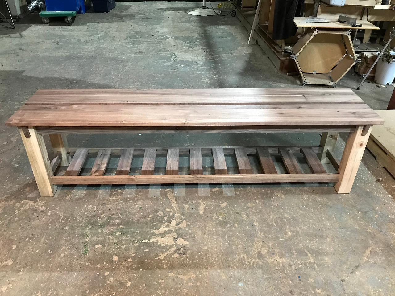 결과물을 보니 뿌듯하다. 짜맞춤 방식이 부재가 많고 구석구석 신경 써야 할 부분이 많아 꽤 꼼꼼하게 해야 했고 시간도 생각보다 오래 걸렸다. 그래도 쓰레기로 처리될 폐목재와 버려진 테이블 상판이 멋진 벤치로 다시 태어났으니 말 그대로 환골탈태다. 마지막 작업으로 오일까지 바르니 월넛 본연의 색상이 살아난다. 위에 언급한 대로 상판을 고정하기 위해 나사못 6개를 사용했지만 나름 짜맞춤 가구다.
