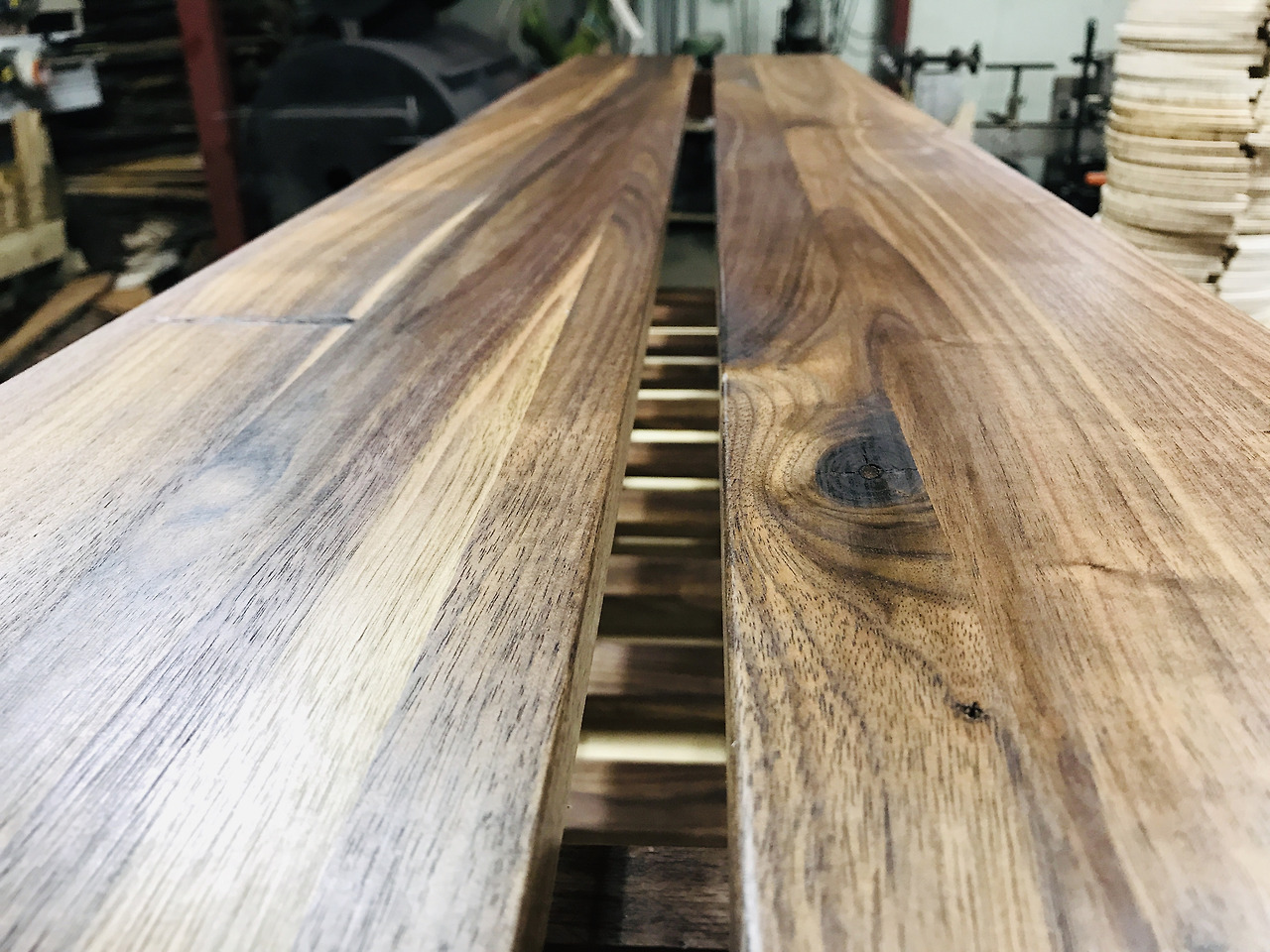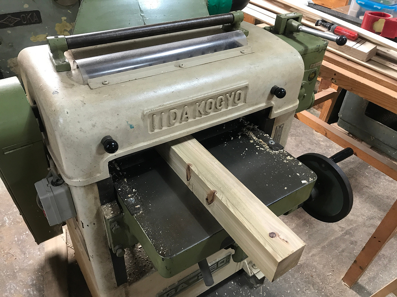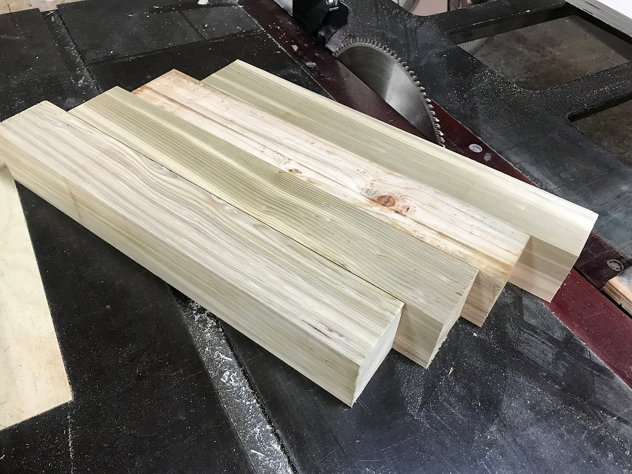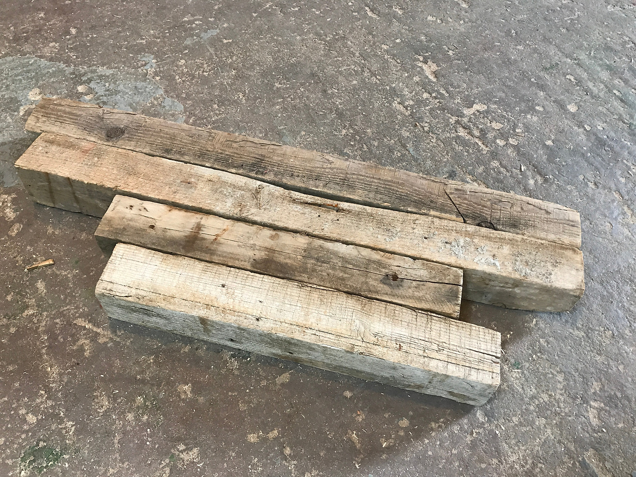 먼저 벤치 높이를 정하고 다리를 만들었다. 구조목을 자르고 바깥쪽 오염된 부분을 켜냈다. 그리고 다시 수압 대패와 자동대패로 다듬었더니 단정한 각재로 태어났다. 수종은 스프루스 계통인 것 같은데 색깔이 녹회색인 게 특이하다.