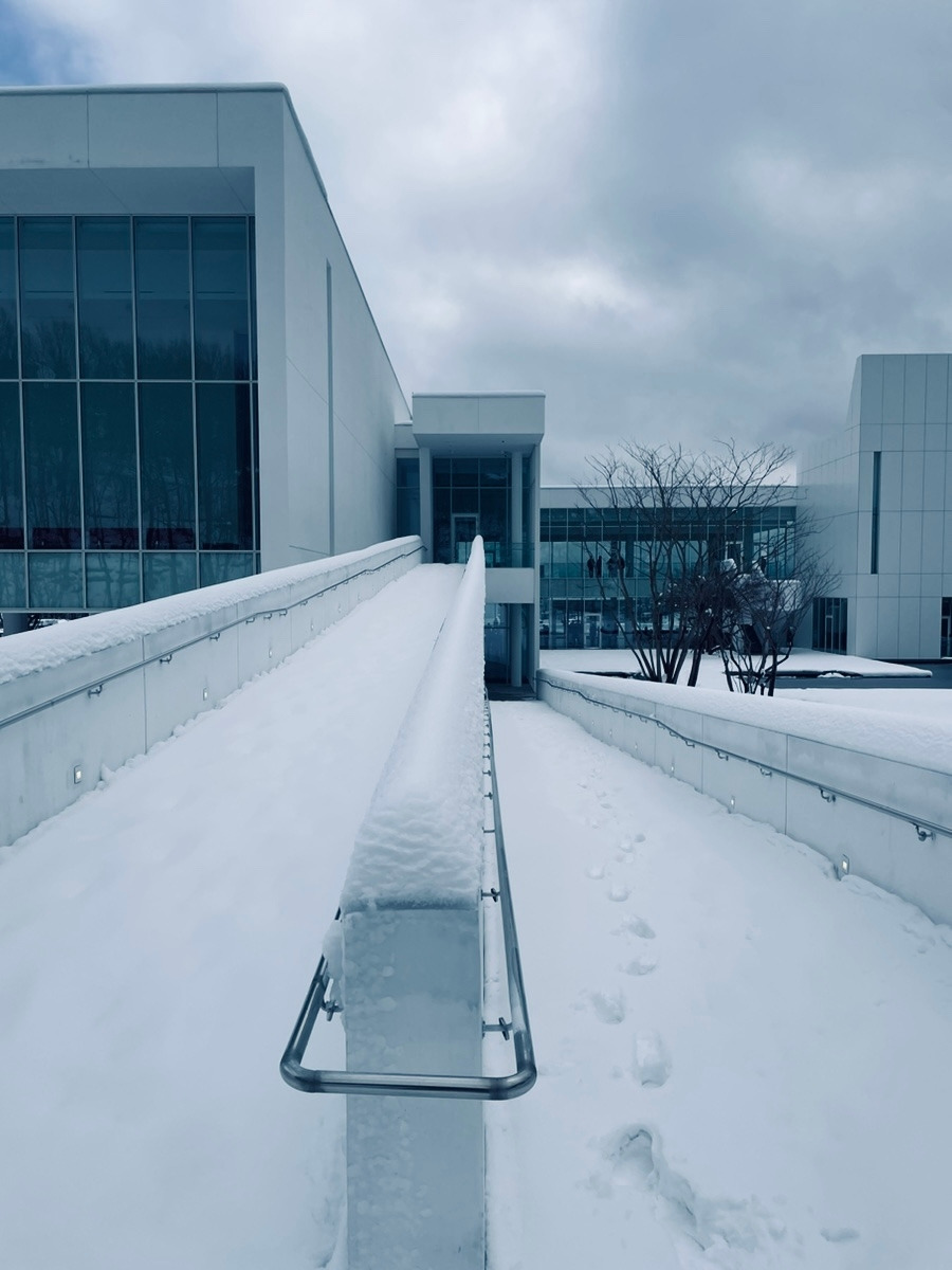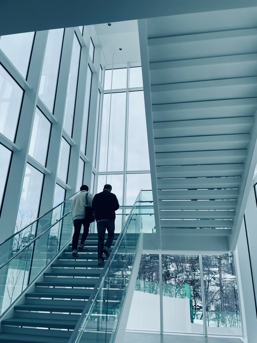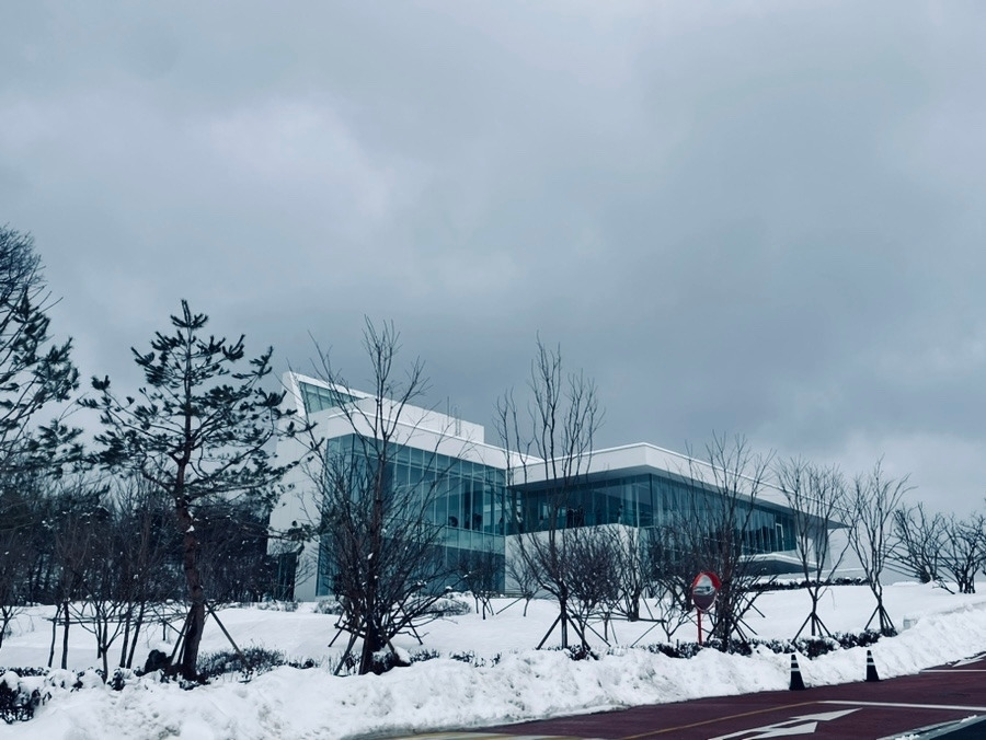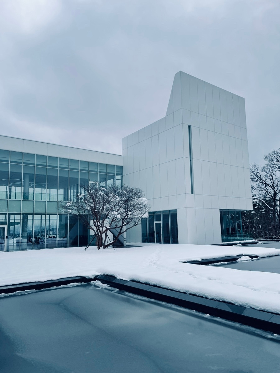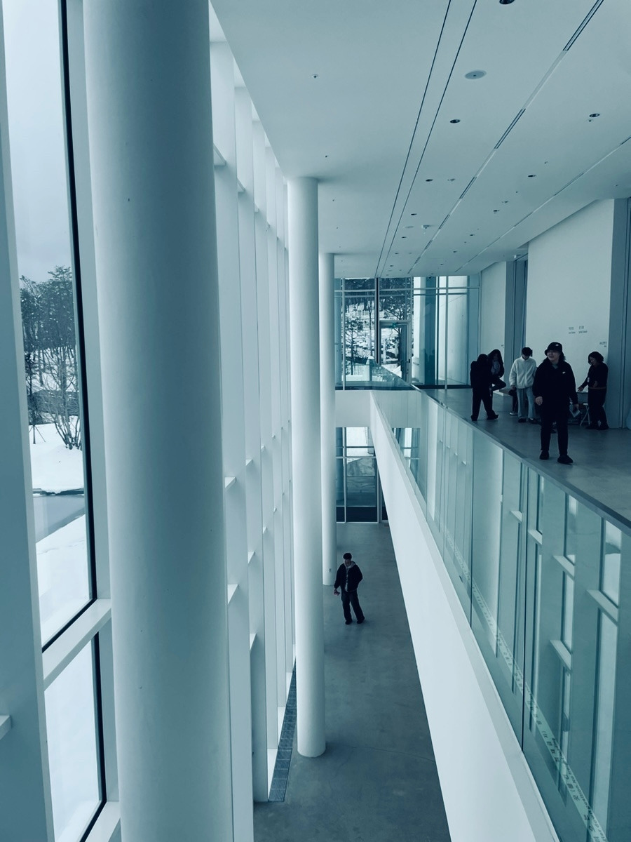 기둥너머 분절된 창을 지나 눈 덮인 풍경이 아름다웠습니다.