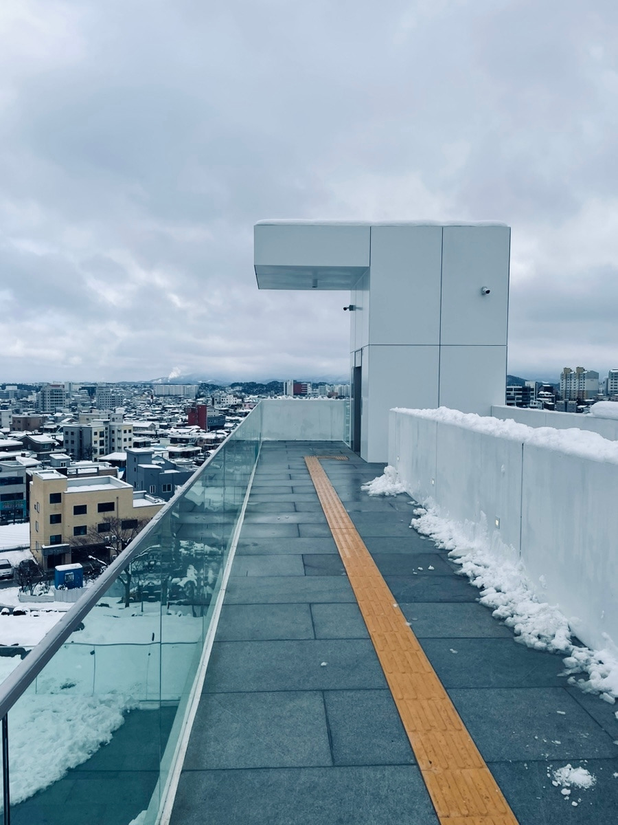경사로는, 걸어올라감에 따라서는 눈 앞에 새하얀 산턱이 보이지만, 도는 순간 건물의 전경을 포착하게 됩니다.