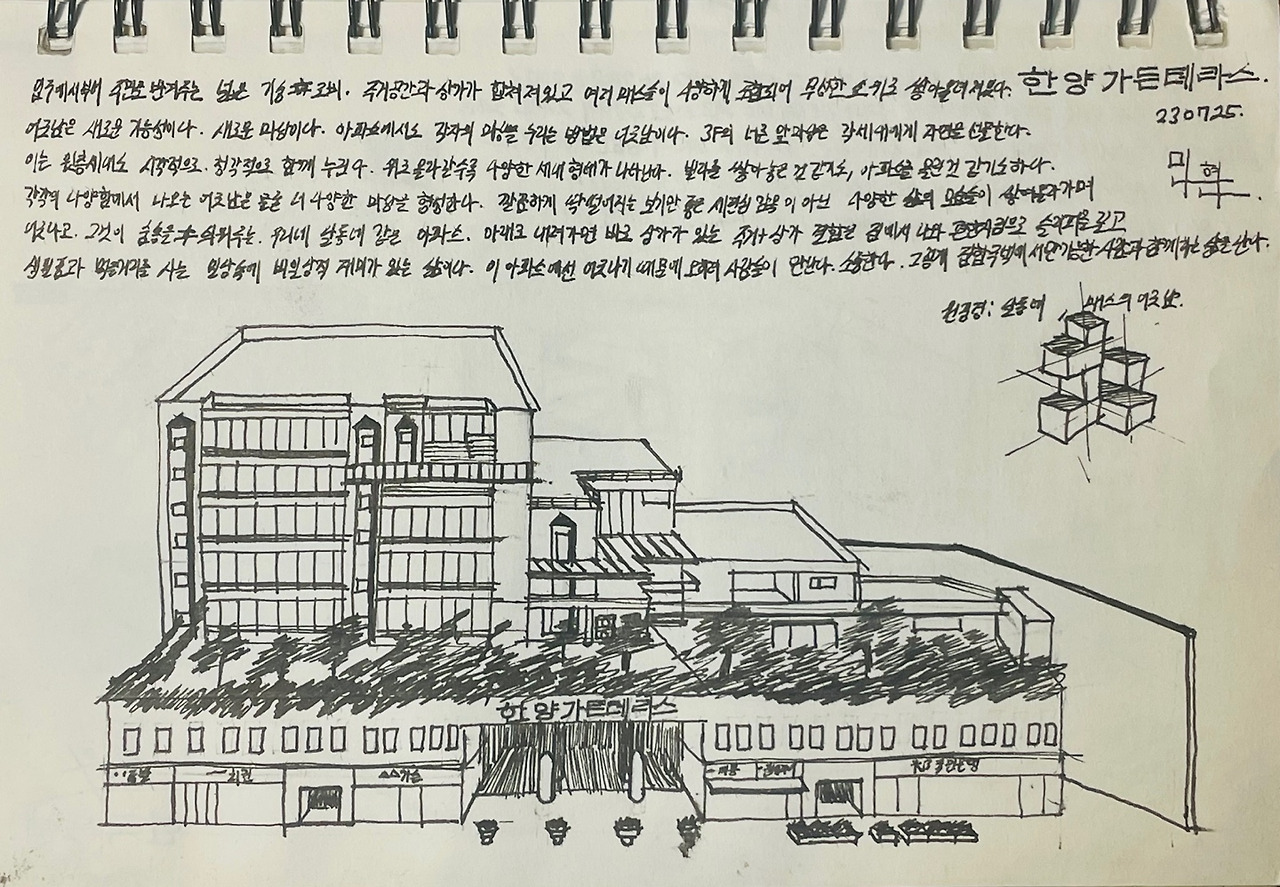 한양가든테라스는 거리에 면해 있으면서 가로의 활력에 기여하며 상가는 입주민과 인근지역 주민 또한 혜택의 대상으로 삼는, 조금 더 친밀하게 상가와 아파트가 혼합된 "상가아파트" 유형이었습니다.