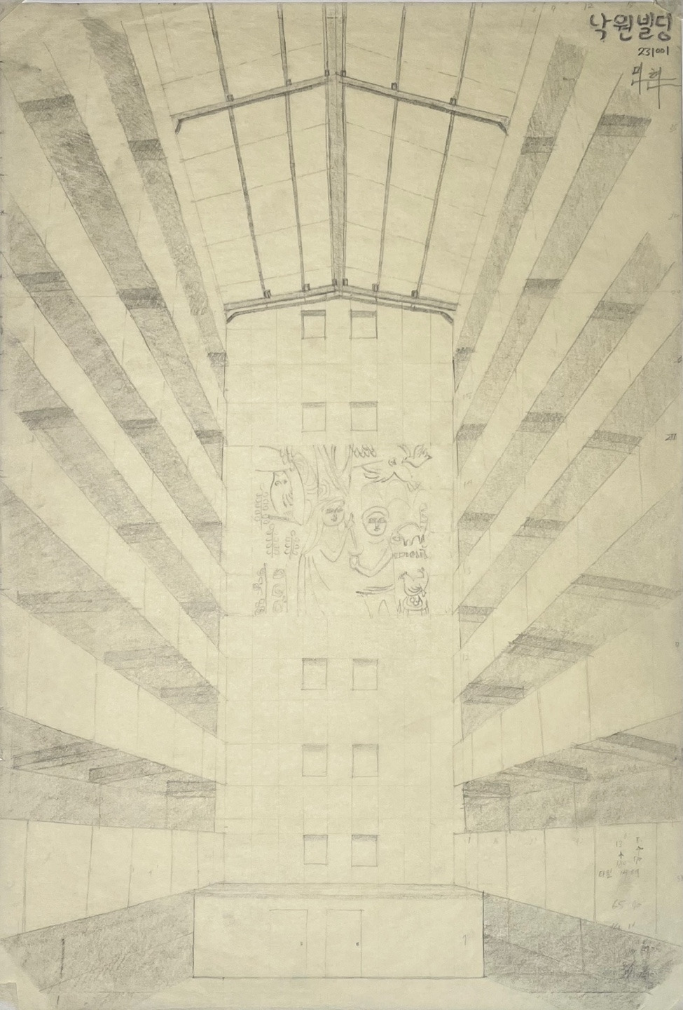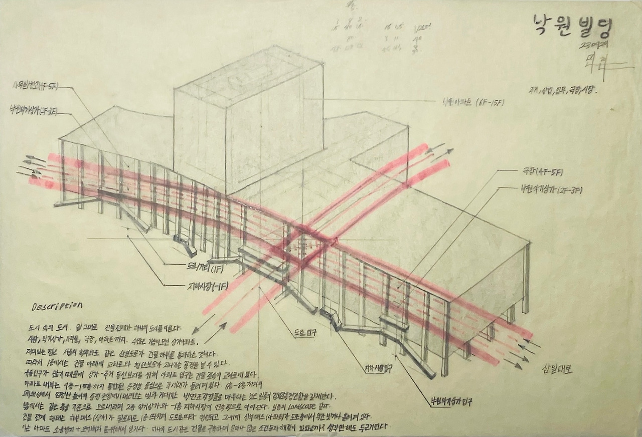 건물 하부매스(상가)가 필로티로 한 층 띄워져 도로를 따라 형성되고, 그 위에 상부매스(아파트)가 도로 축에서 약간 틀어져 있기 때문에 낙원빌딩을 외부에서 보면 어디서나 약간 불편한 인상을 갖게 됩니다.