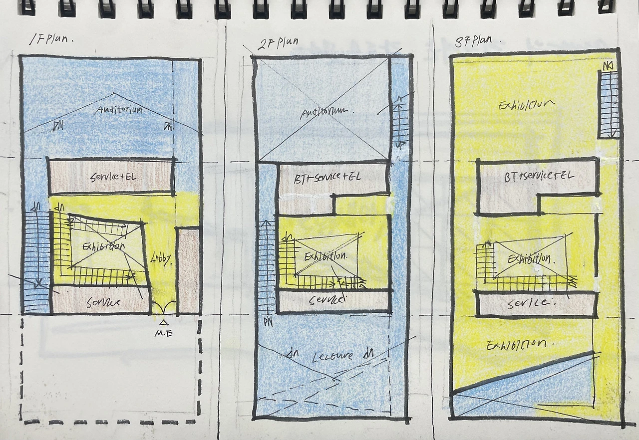 간단하게 스케치해본 1,2,3 층 평면도에서 이를 알 수 있습니다.