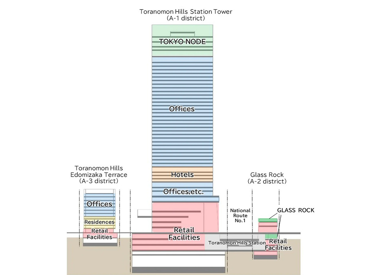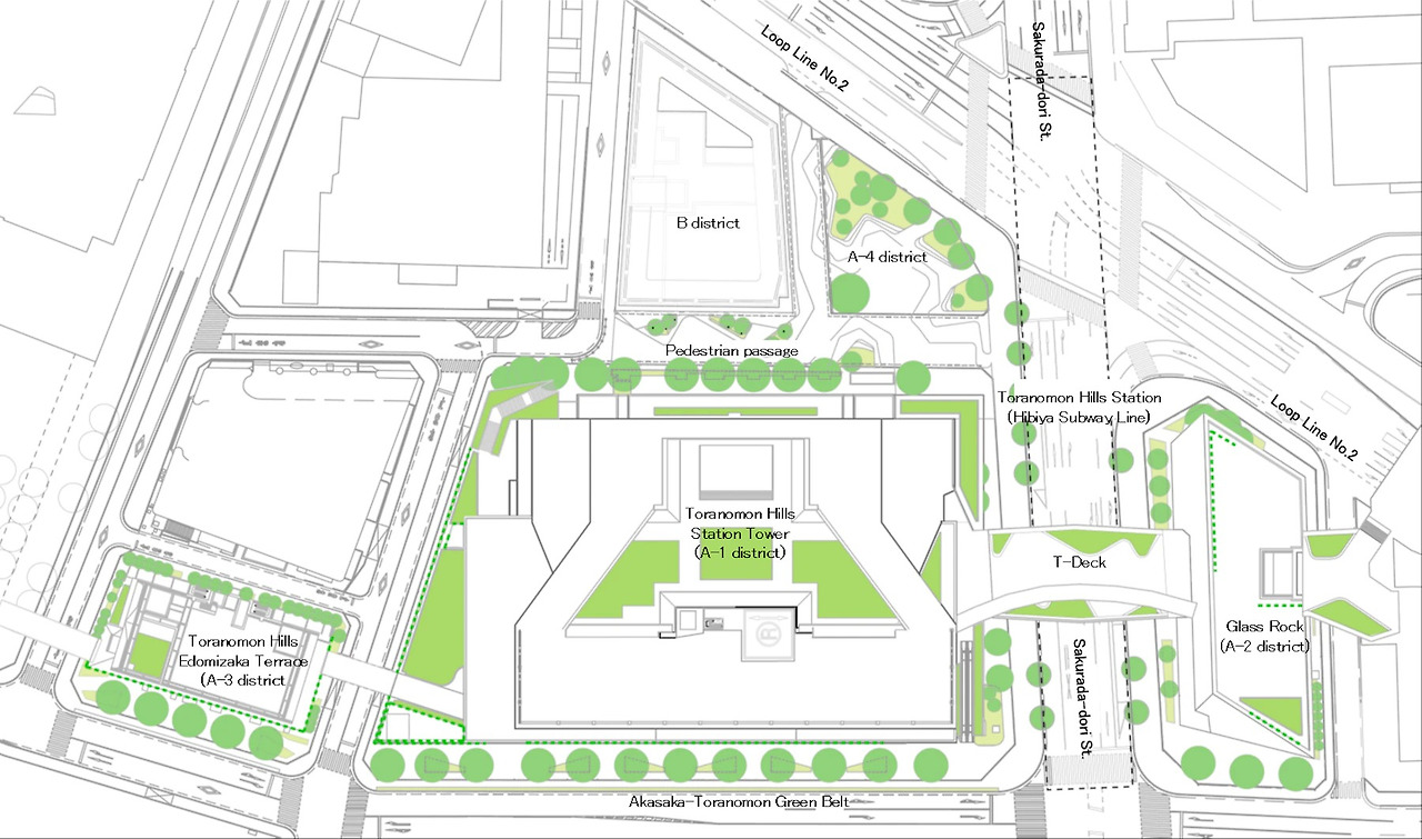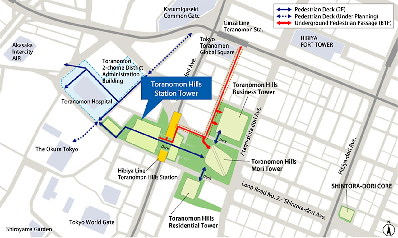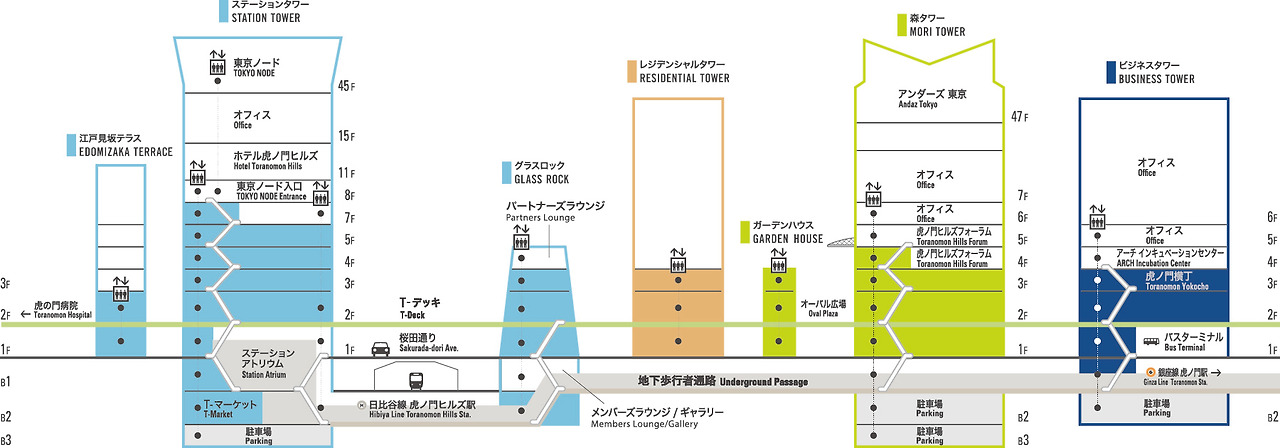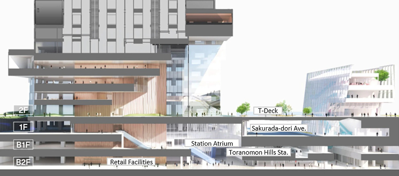 이에 따라, 토라노몬힐즈의 건물들은 스카이데크의 2층을 메인레벨로 설정하며, 이를 기준으로 나누어 설계한 모습을 볼 수 있습니다.
