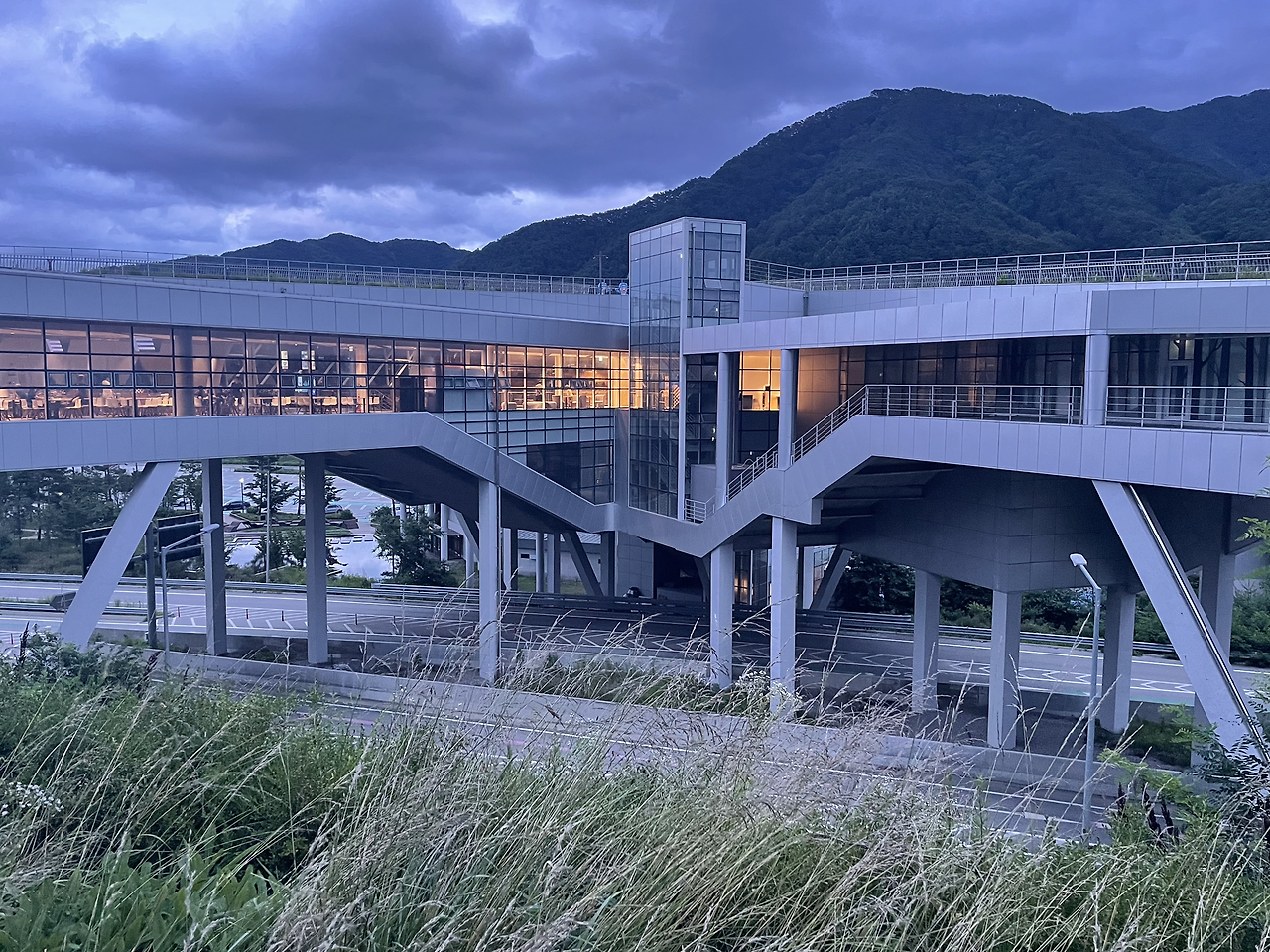 첫번째와 두번째 문제의 해결을 위해 내린천휴게소는 먼저 자연스레 공중으로 띄워져 아래로 나가는 방향 도로를 지나가게 했습니다.