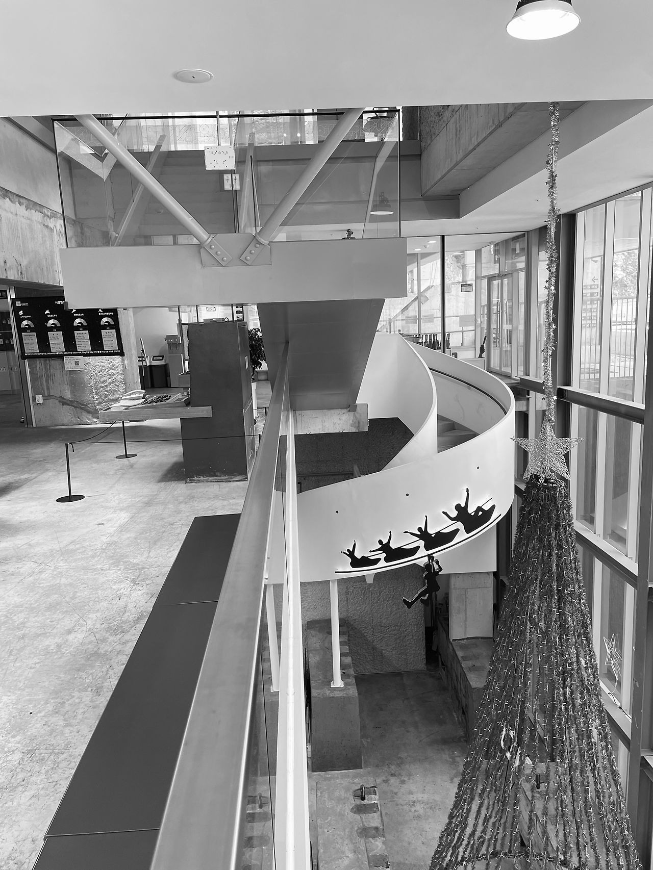 분명 1층이 있는데도, 멀리서 보면 건물은 매달린 전시관 매스밖에 보이지 않습니다. 그 이유는, 1층부를 유리로 두르는 동시에, 이를 안으로 밀어넣어 잘 보이지 않도록 만들었기 때문이예요. 이러한 눈속임으로 건축가가 의도한 “매달림” 이라는 컨셉은 더욱 강조됩니다.