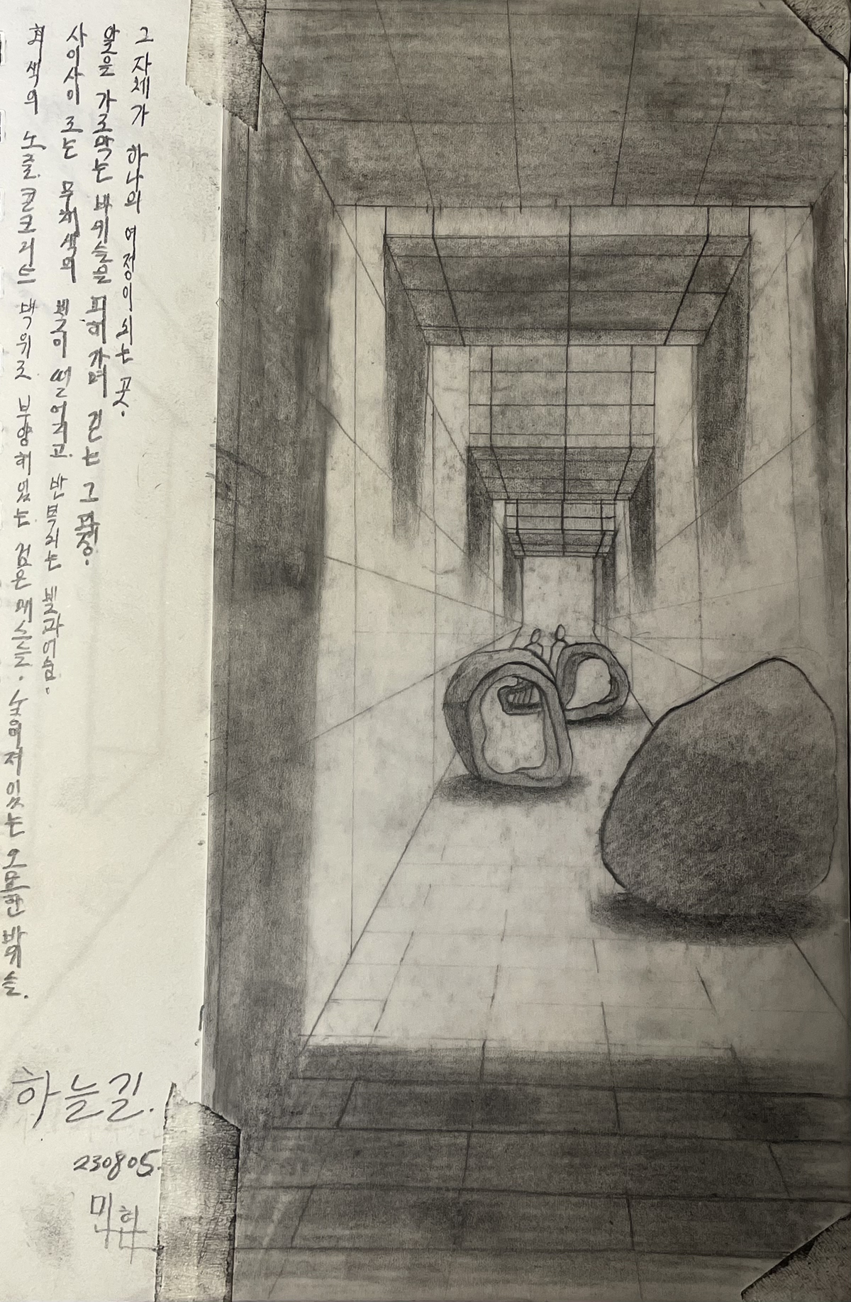 하늘길에는 회색빛의 노출콘크리트로 이루어진 양쪽 벽의 높은 곳에 자리잡은 사각형의 매스들 사이사이로 밝은 빛이 쏟아지고, 그 아래의 경사로에는 오묘한 형태의 바위들이 자리잡고 있습니다.