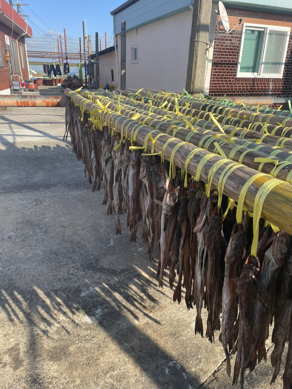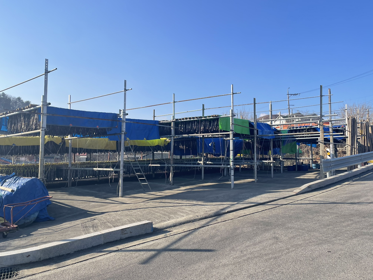 기대어져 있는 나무 막대들에 명태를 끼운 후, 이걸 가설구조물 위에 올려, 천을 덮어놓는 식으로 말리는 듯 했어요.