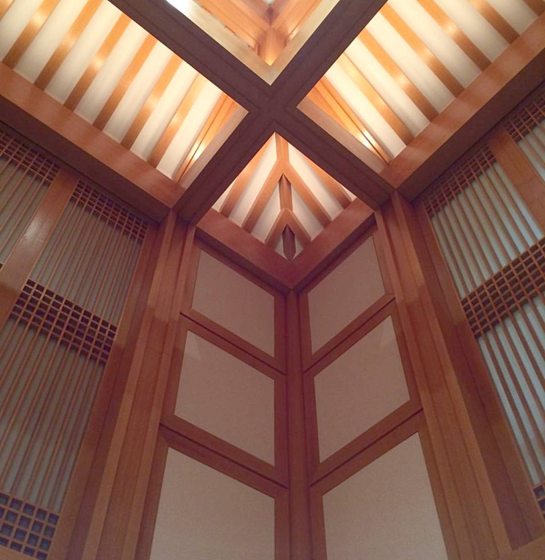 안을 살피면 주 홀 천정은 한옥 대들보 디자인은 차용하고 창호도 우리의 그것에서 땄다.