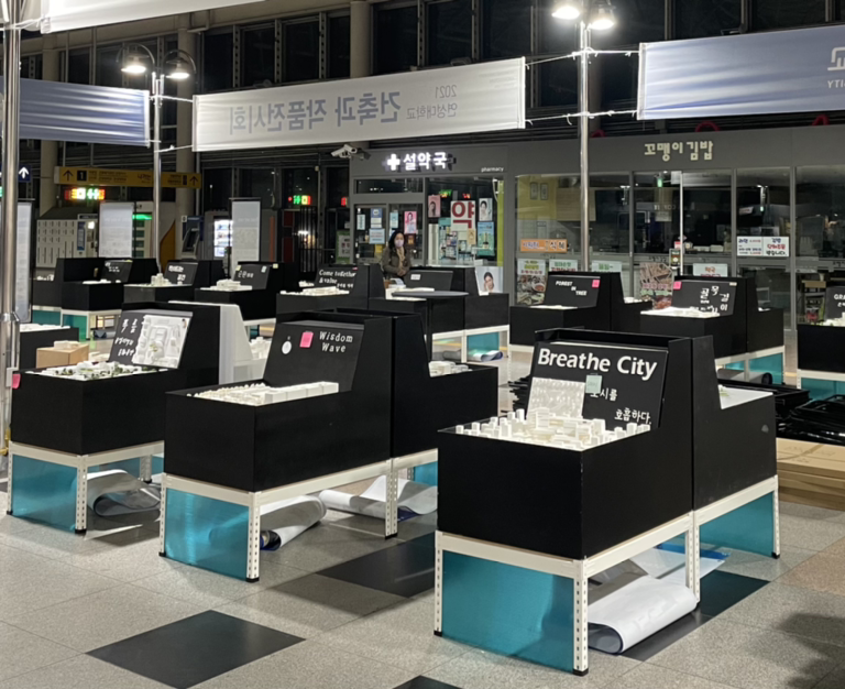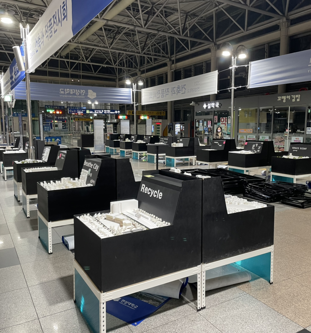 조금 풀어진 새벽 미명의 출근길에서 역사안에 전시준비를 하고 있는 한 대학 건축학도들의 졸업작품전이 슬며시 입꼬리를 올립니다.