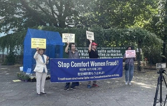 베를린 평화의 소녀상에서 26일(현지시간) 한국 보수단체 소속 4명이 소녀상 앞에서 "위안부는 전시성폭력 피해자가 아니다"라며 소녀상의 철거를 촉구하고 있네요.