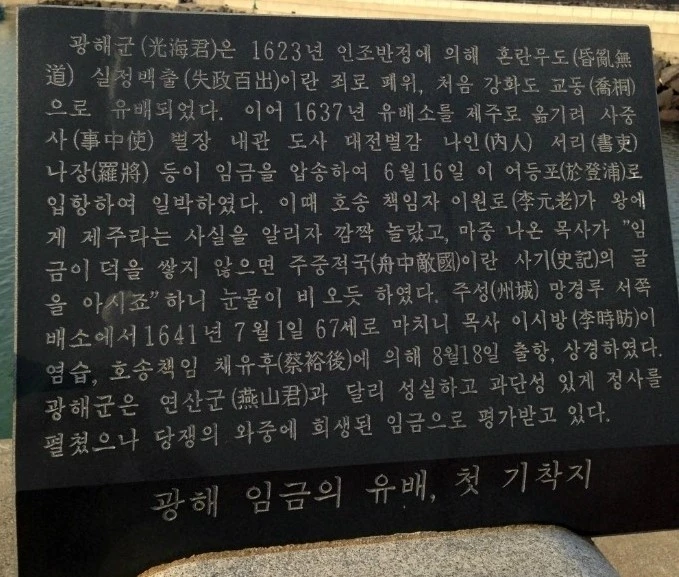 광해군의 유배선은 제주 어등포(구좌읍 행원리)로 입항하여 포구에서 하루를 보낸 광해는 제주로 들어와 처소에 안치되었다.