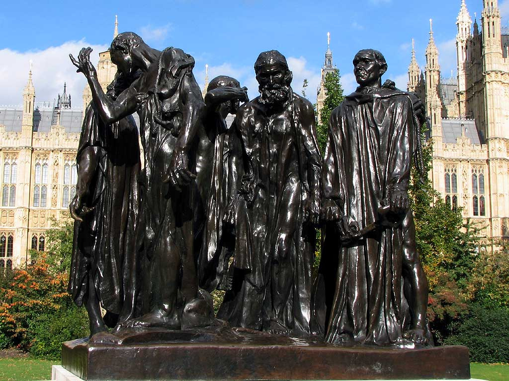 전쟁에서 승리한 영국왕 에드워드 3세는 모든 시민의 생명을 보장하는 조건으로 누군가가 그 동안의 반항에 대한 책임을 져야 한다며 깔레의 시민 여섯명을 처형 하겠다고 했다.