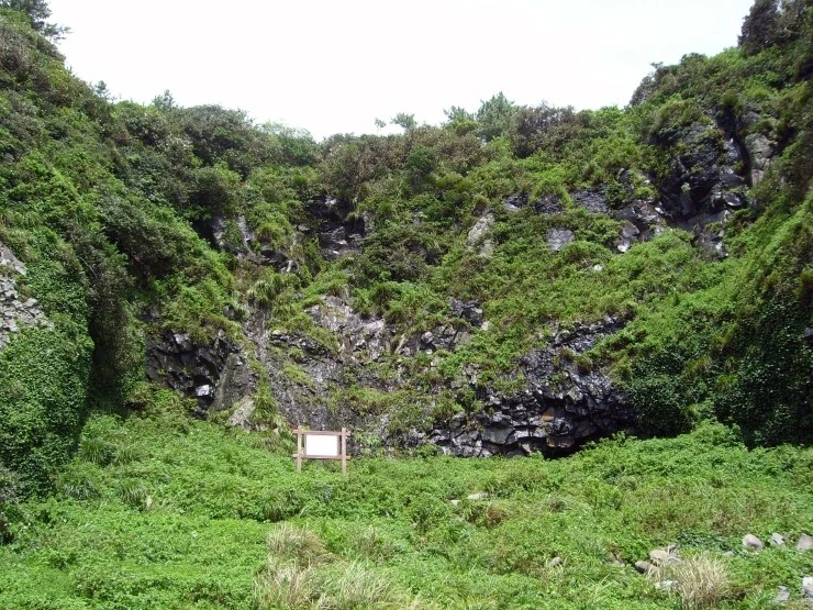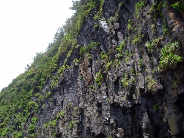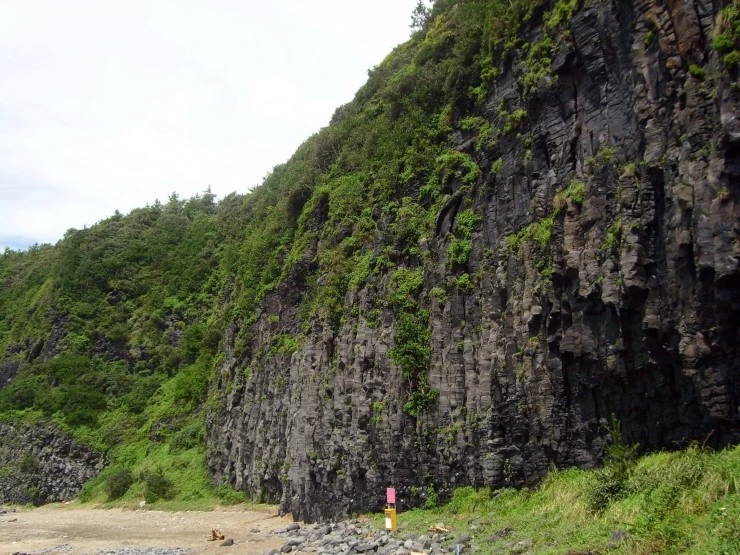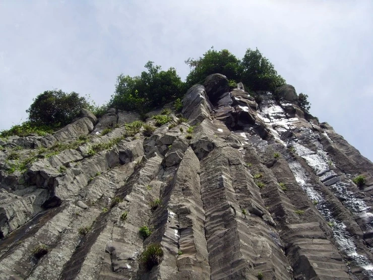 정상부에는 나무와 풀이 자라고 있는 거대한 창끝처럼 생긴 주상절리대.