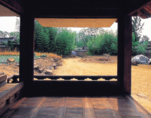 나무기둥, 기와지붕, 대청마루, 돌과 나무...
