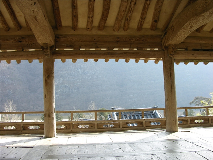 다듬지 않은채 생긴대로 끼워맞춘 기둥들 사이로 보이는 푸른절벽은 한폭의 그림이 된다.