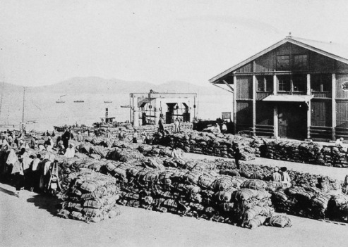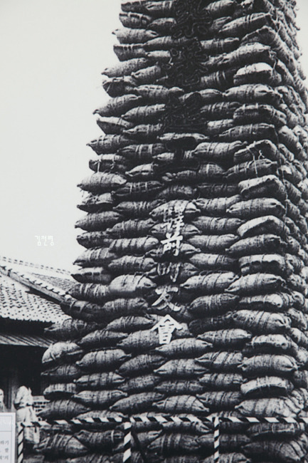 부둣가에 탑처럼 쌀을 쌓아놓은 풍경...