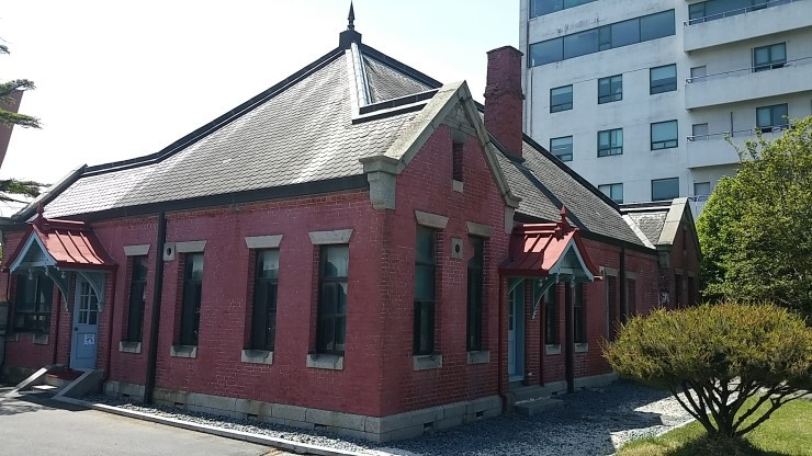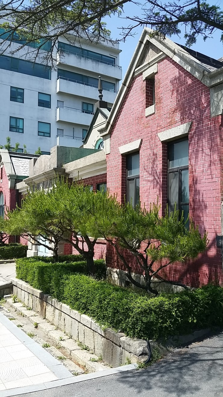 정면 중앙의 출입구는 화강석으로 마감하였고 바깥벽은 붉은 벽돌을 쌓았다.