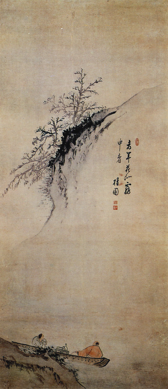 높은 언덕에 매화가 피어 있고, 배를 탄 노인이 종자와 더불어 매화를 바라보고 있다.