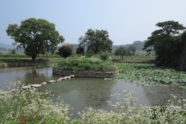 동쪽으로 뒷산이 반달모양으로 싸안고 좌측으로 白馬山백마산이 청룡을 이루고, 우측으로는 娥眉山아미산이 백호를 이루어 풍수지리상 명당자리.