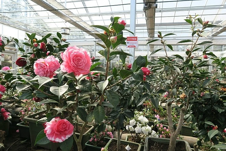 카멜리아힐에는 세계 각국에 서 모은 수백 종의 동백이 사철 꽃을 피운다.