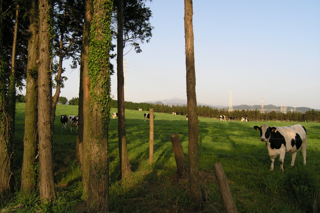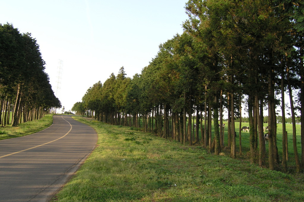 목장을 가로지르는 삼나무길 너머로는 목장길 끄트머리에 이곳의 랜드마크 건물이 있다.