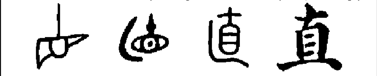 直직은 十십과 目목과 乚(숨을 隱은의 고자)이 합쳐진 會意회의자로, 여러 개 또는 많은 사람의 눈으로 숨은 것을 바르게 볼 수 있다는 뜻이 합쳐져 바르다, 곧다는 의미가 되었다.