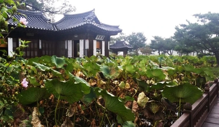 연못엔 연꽃이 활짝 만개하고 물위에 쌍정자가 둥실둥실 떠 있고.