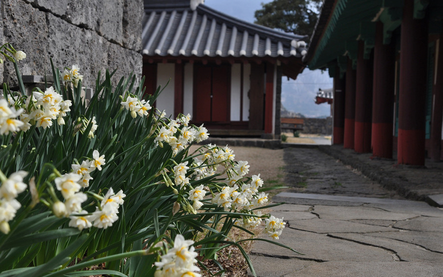 단산을 배경으로 자리 잡은 향교 돌담에 피어난 수선화는 유백색 꽃잎으로 그 자태를 뽐낸다.
