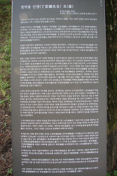 생가 왼쪽으로 與猶堂여유당이라 새긴 비머리돌을 지나 언덕을 오르면 생가를 정면 발치에 둔 묘가 소박한 모습으로 자리잡고 있다.
