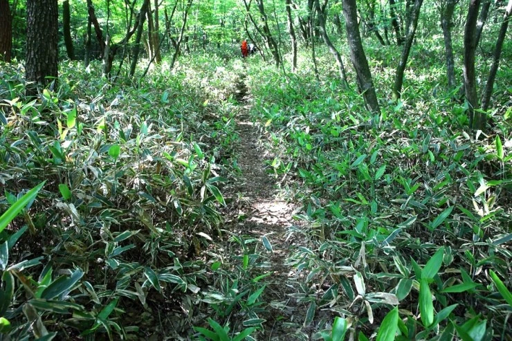 안내판 뒤쪽을 통하여 작은 계곡을 지나니 조릿대가 군락을 이루고 있고 그 사이로 길 흔적이 있다.