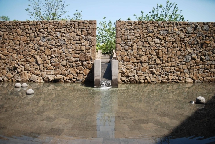 ㄴ자형 평면 안마당에 45도로 현무암을 쌓고 물을 떨어트립니다.