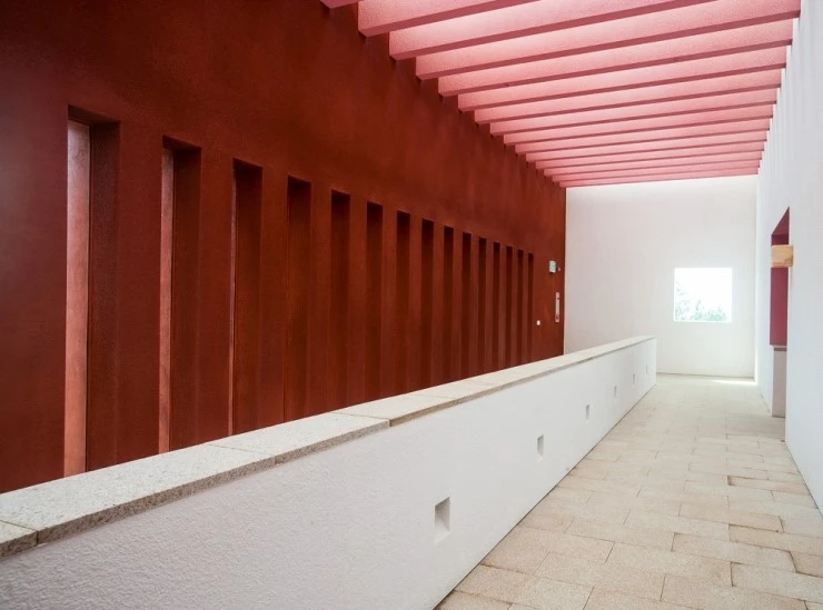 그는 분절된 벽체를 여러겹으로 세워 바람이 드나드는 길과 그늘을 만들었다.