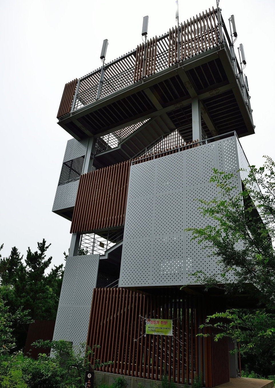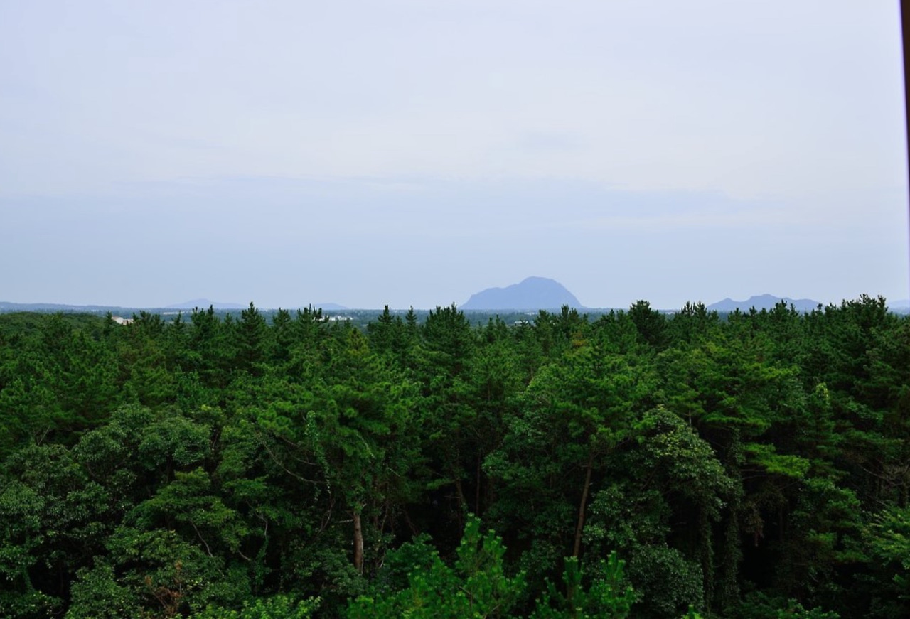 높이 15m의 전망대에서는 멀리 한라산과, 다른 쪽으로는 바다도 보인다.