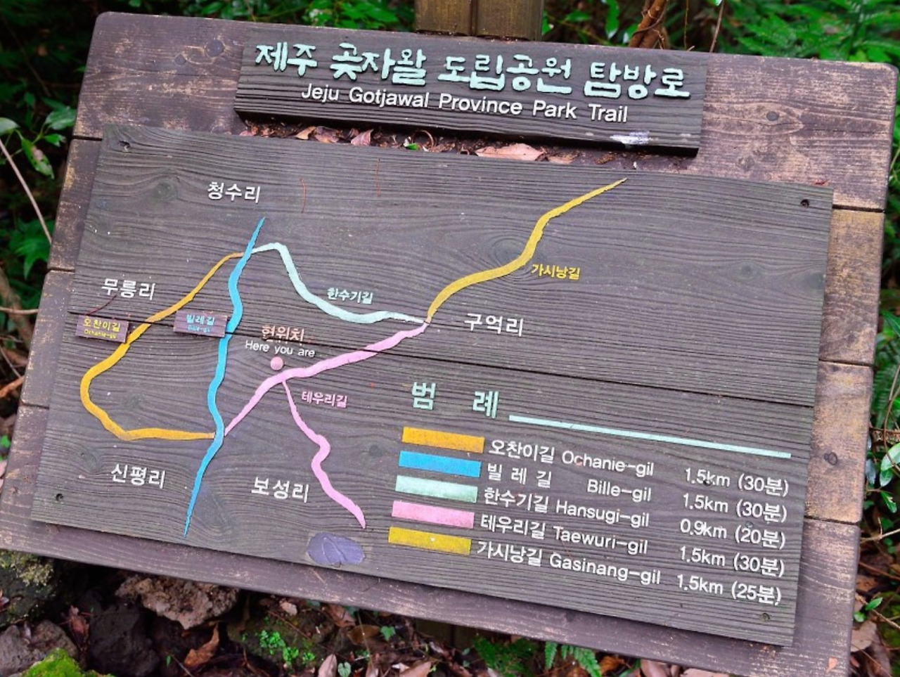 제주 곶자왈 도립공원은 서귀포시의 한경∼안덕 곶자왈지대 가운데 있는 곳으로 탐방안내소를 기점으로 총연장 6.5km의 거리 중 테우리길(1.5㎞), 빌레길(1.5㎞), 오찬이길(1.5㎞), 한수기길(0.9㎞), 가시낭길(1.1㎞)등의 코스로 한 바퀴를 둘러볼 수 있다.