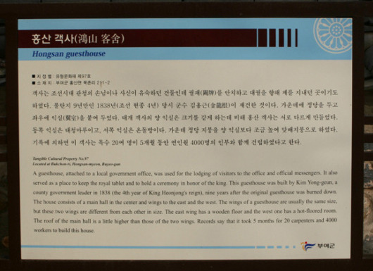 客舍記객사기에 따르면 인부 4,000여 명에 목수 20여 명이 동원되어 5개월에 걸쳐 완성했으며 건축비는 일반인의 기부금과 公金공금으로 충당했다고 한다.