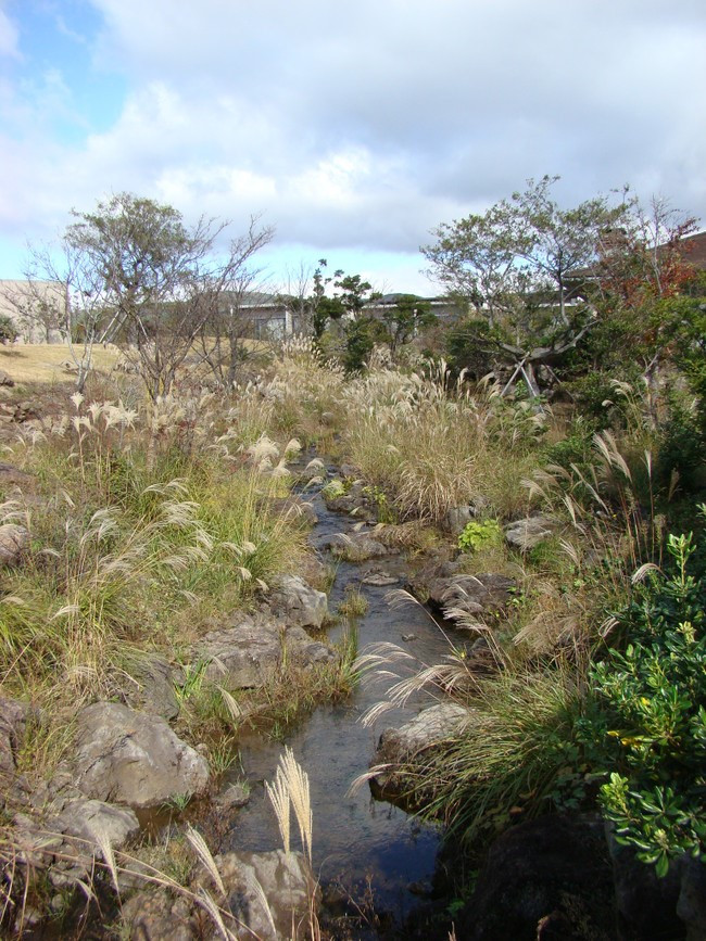유리상자안에 햇빛이 쏟아지면서 갈대가 흔들리고 전면으로는 냇가가 흘러 나가고 다시 새로운 중정이 만들어지면서 객실이 돌아간다.