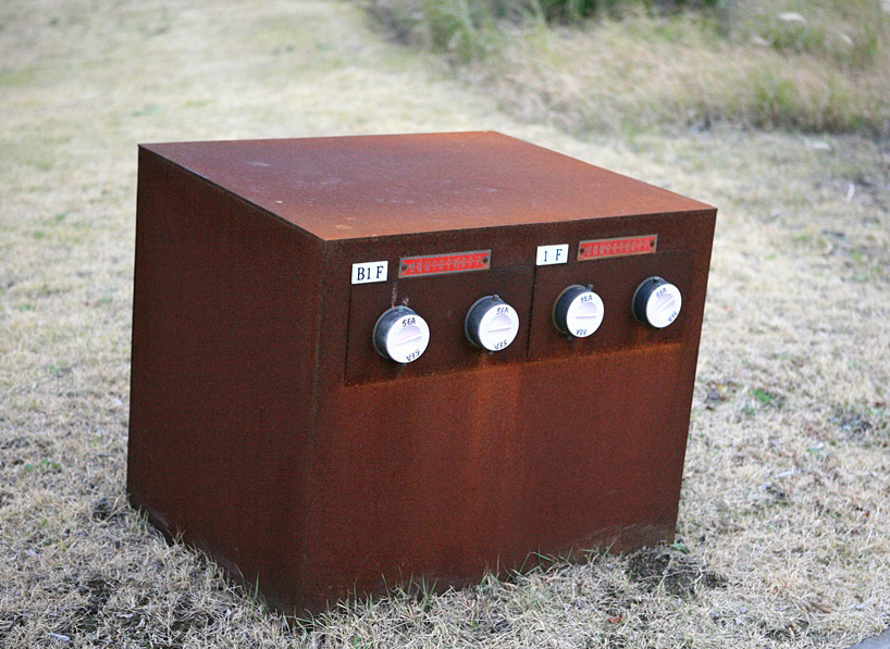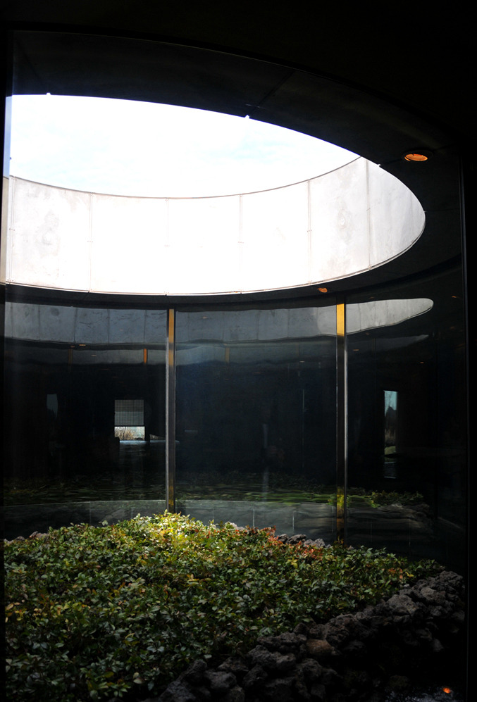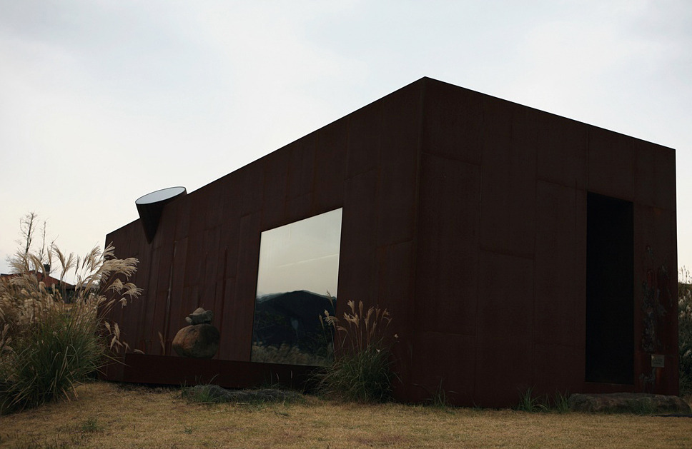 반짝이는 우주선 밖으로 돌아가니 이번에 코르텐강이되어 벌건 상자 밑으로는 냇가가 흐르고 전면의 커다란 유리창 앞에 거대한 불상이 하나 앉아 있다.