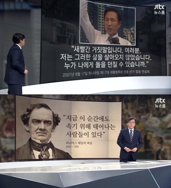 며칠전 jtbc 뉴스룸 앵커브리핑에서 MB를 향한 이야기에서 대중은 자신이 속는 줄 알면서도 즐거워 하는 경향이 있다라는 바넘의 말을 인용했다.