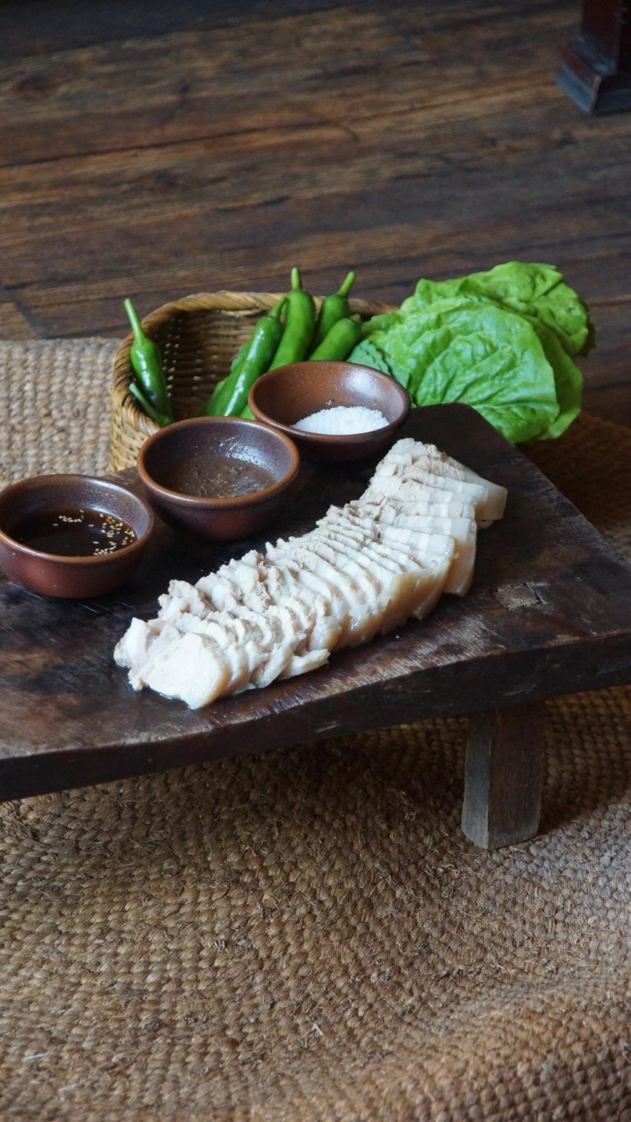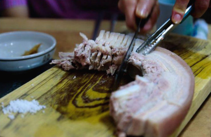 금방 삶아 김이 모락모락 나는 돼지고기, 미리 주방에서 썰어 놓으면 식어버려 맛이 떨어진다는것이다.