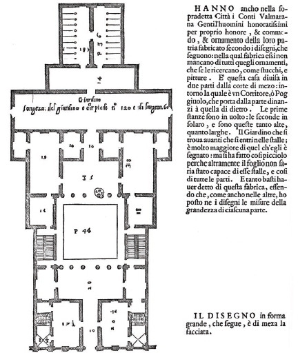 그가 그의 책 건축 4서에 언급하였듯이 이 계획에서는 전망대처럼 주변을 에워싼 모든 자연과의 관계가 중요했습니다. 이러한 주제와 함께 주변 환경에 순응하는 적합한 형태를 중앙집중형 평면으로 4면이 동일한 상징적인 면을 가진 모습으로 계획되었습니다. 4면의 상징적인 입면은 그가 고전 건축에서 바라본 레퍼런스들을 주로 인용하였습니다. 나지막한 언덕에 위치한 장소를 완결된 형태로서 장소를 규정하고 싶었던 팔라디오의 의지가 잘 나타납니다.