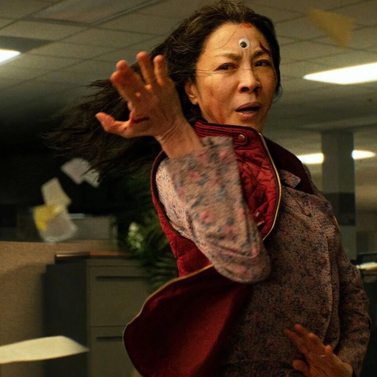 허무주의에 빠진 조이가 보여준, 흰 구멍이 뚫린 검정 베이글. 그 베이글의 안팎을 바꾸면 검정 구멍이 뚫린 흰 베이글이 된다. 양자경(에블린 역)이 이마에 붙인 그 눈알처럼. 이렇게 조금만 관점을 달리한다면 무의미 속에서 의미를, 최악 속에서 최선의 답을 찾을 수 있을지도 모른다.
