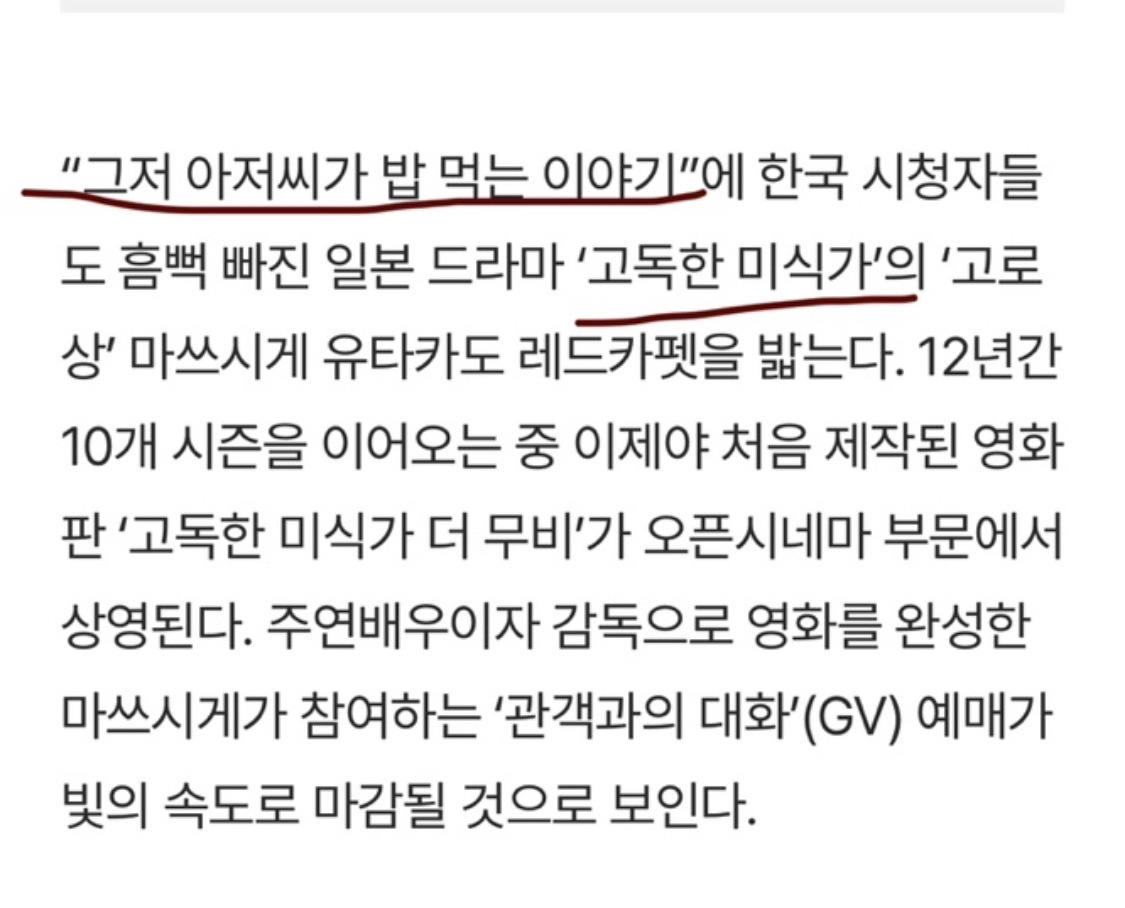 만화를 원작으로 2012년부터 TV도쿄를 통해 방영되고 있는 『고독한 미식가』가 영화로 만들어졌다. 일본뿐 아니라 한국에서도 인기를 끈 이 시리즈는 2023년 10번째 시즌까지 방영됐고 주인공 고로를 맡아온 배우 마츠시게 유타카가 직접 연출을 맡아 마침내 극장판까지 제작됐다. [남동철, 제29회 BIFF]