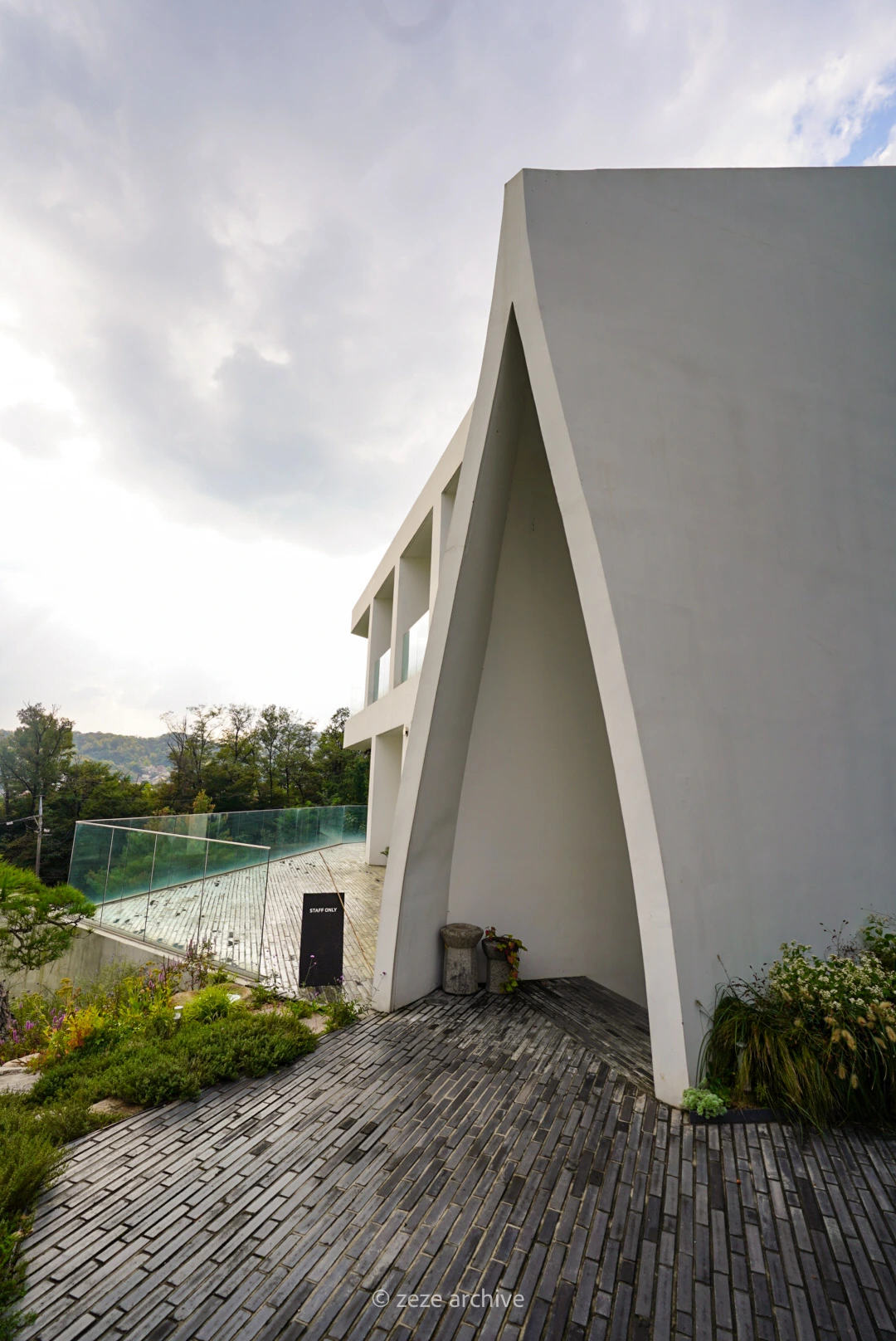 차를 타고 언덕을 한참 올라와 막다른 골목에 다다르면 안쪽에 뾰족하게 솟은 건축물을 마주한다. 새하얗고 거대한 파사드는 간판과 문구도 없어 이곳이 주택인지, 갤러리인지, 혹은 카페인지 알아채기 어렵다. 실제 카페는 지상에서는 보이지 않는다. 대신 거대한 삼각형 홀이 시선을 사로잡아 사람들의 발길을 이끈다. 오버스토리 성북의 이야기는 여기서부터 시작한다.
