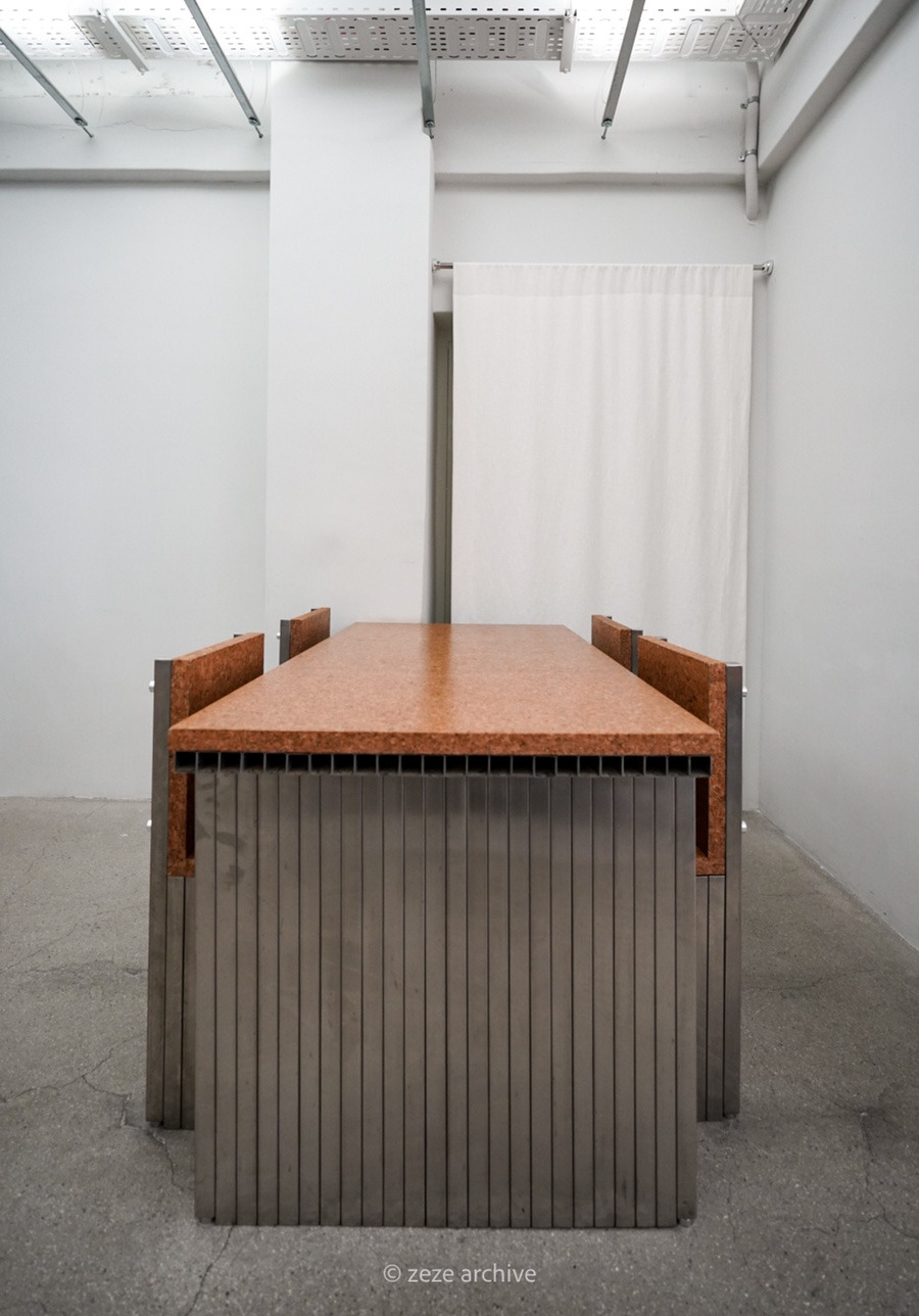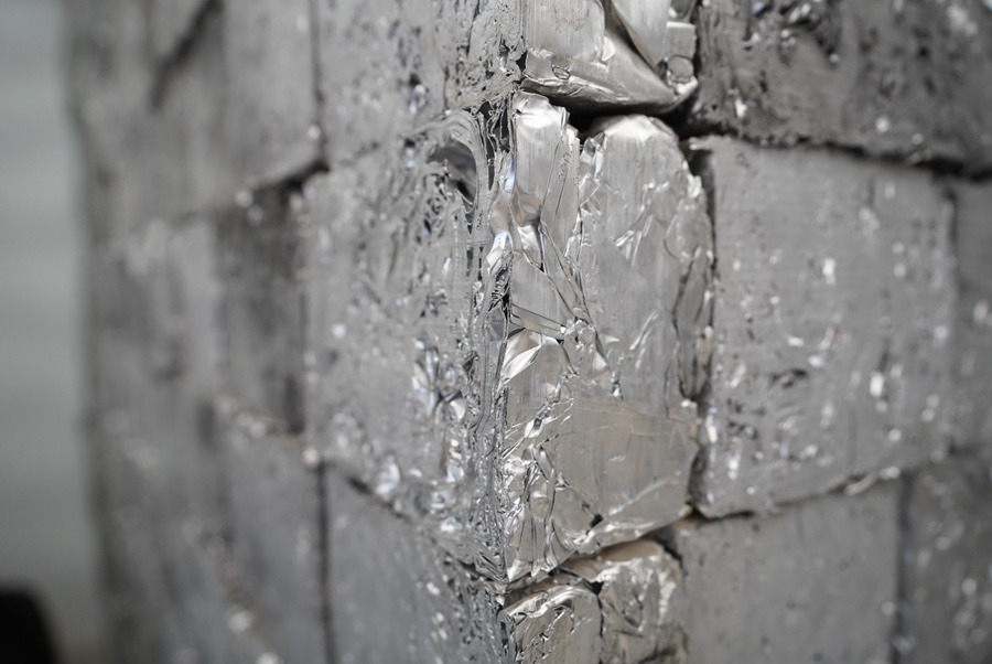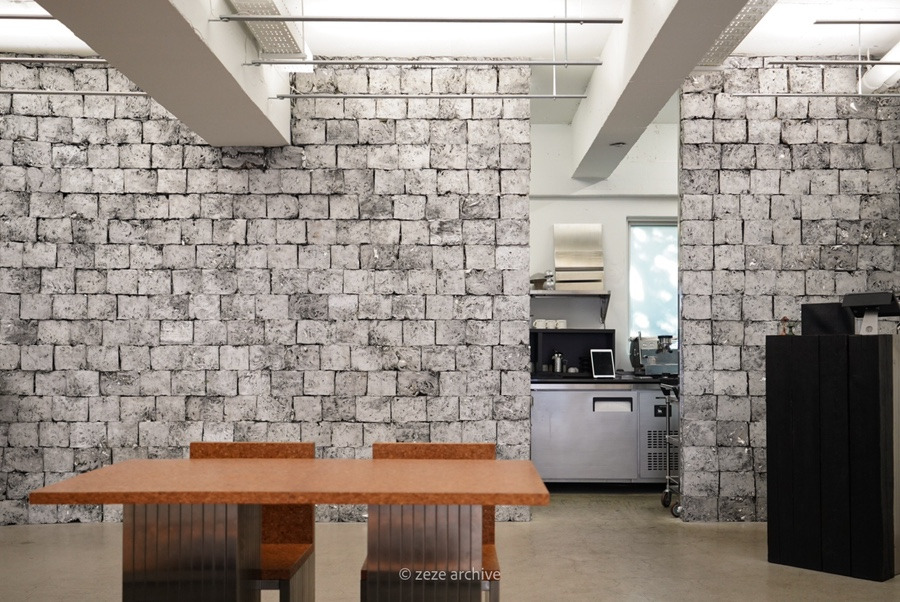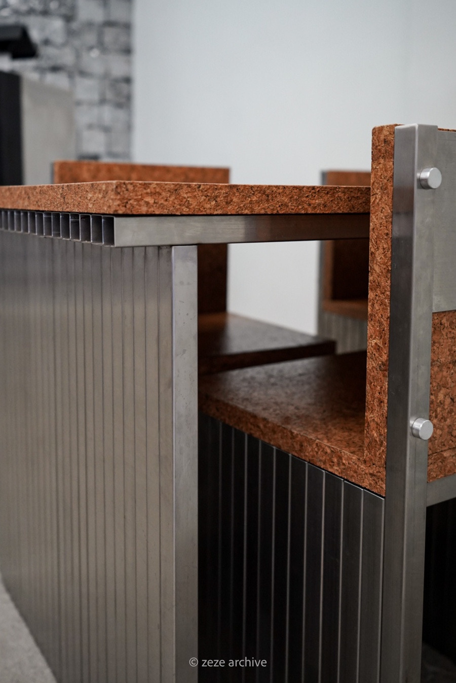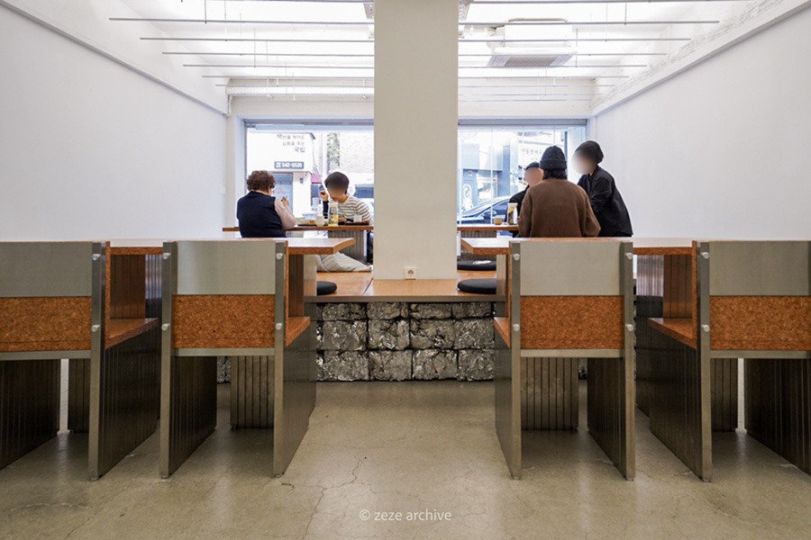 비건이라는 주제 아래서 친환경적인 공간을 만들기 위해 ATHLIER KHJ에서 선택한 재료는 폐알루미늄이다. 폐알루미늄을 압축하여 큐브 형태로 만들었고 이를 벽면과 평상 받침, 외부 앉음벽에 사용했다. 폐알루미늄은 용광로에서 녹여 재사용이 가능하니 이 공간이 철거되더라도 벽면과 평상에서만큼은 폐기물을 배출하지 않는다. 우리는 완공 후에 화려하게 탈바꿈한 공간만 보지만, 사라질 순간까지 환경을 생각하여 만든 이곳이 의미가 깊은 이유다.