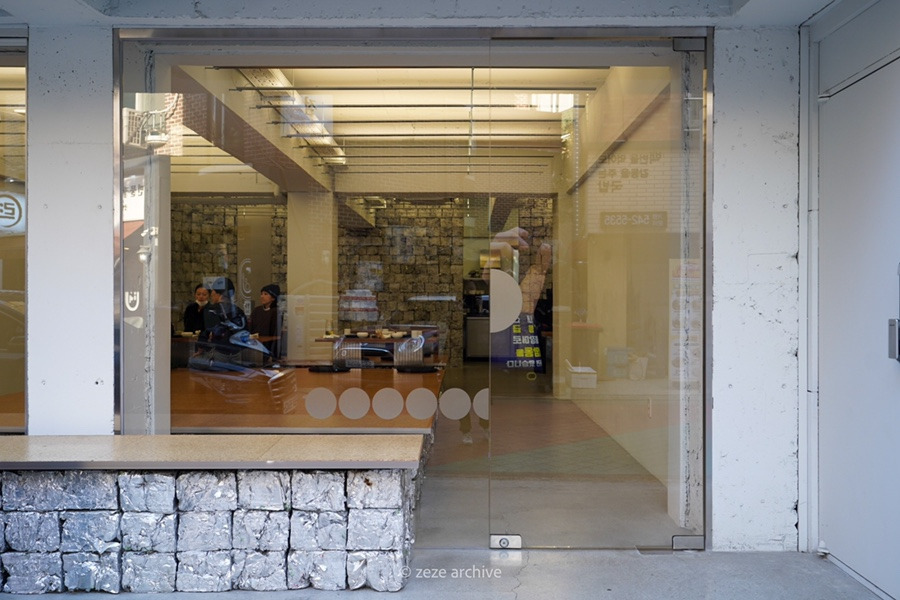 '점점점점점점’은 비건 식당이면서 전시관이고, 카페이다. 때로는 워크숍이 진행되기도 한다. 다양한 용도로 공간을 운영하다 보니 포스터나 인쇄물을 프린트할 일이 있는데, 그럴 때마다 가급적이면 잉크를 덜 쓸 방법을 찾았다고. 그중 점(•)이 잉크를 가장 덜 쓰는 문자임을 알게 되어 상호명도 오직 점으로 구성하게 되었다. 점 6개가 모인 말 줄임표는 내면의 말, 침묵에 집중한다는 의미도 담고 있다.